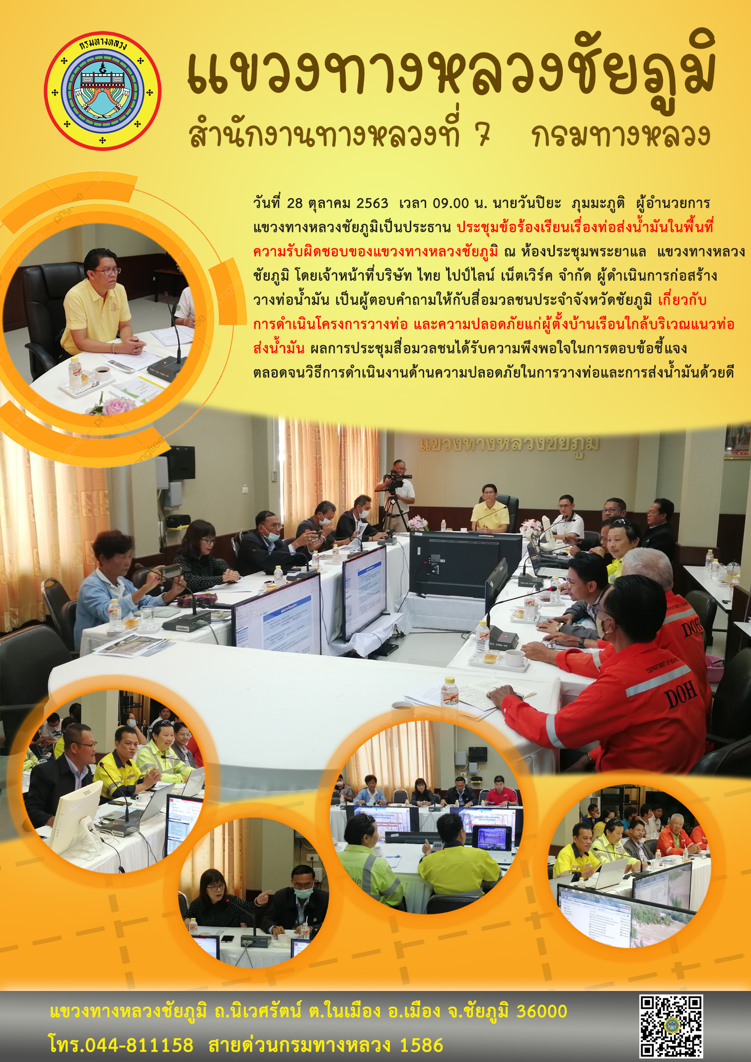 วันที่ 28 ตุลาคม 2563 เวลา 09.00 น. นายวันปิยะ ภุมมะภูติ ผู้อำนวยการแขวงทางหลวงชัยภูมิเป็นประธาน ประชุมข้อร้องเรียนเรื่องท่อส่งน้ำมันในพื้นที่ความรับผิดชอบของแขวงทางหลวงชัยภูมิ ณ ห้องประชุมพระยาแล แขวงทางหลวงชัยภูมิ โดยเจ้าหน้าที่บริษัท ไทย ไปป์ไลน์ เน็ตเวิร์ค จำกัด ผู้ดำเนินการก่อสร้างวางท่อน้ำมัน เป็นผู้ตอบคำถามให้กับสื่อมวลชนประจำจังหวัดชัยภูมิ เกี่ยวกับการดำเนินโครงการวางท่อ และความปลอดภัยแก่ผู้ตั้งบ้านเรือนใกล้บริเวณแนวท่อส่งน้ำมัน ผลการประชุมสื่อมวลชนได้รับความพึงพอใจในการตอบข้อชี้แจง ตลอดจนวิธีการดำเนินงานด้านความปลอดภัยในการวางท่อและการส่งน้ำมันด้วยดี
