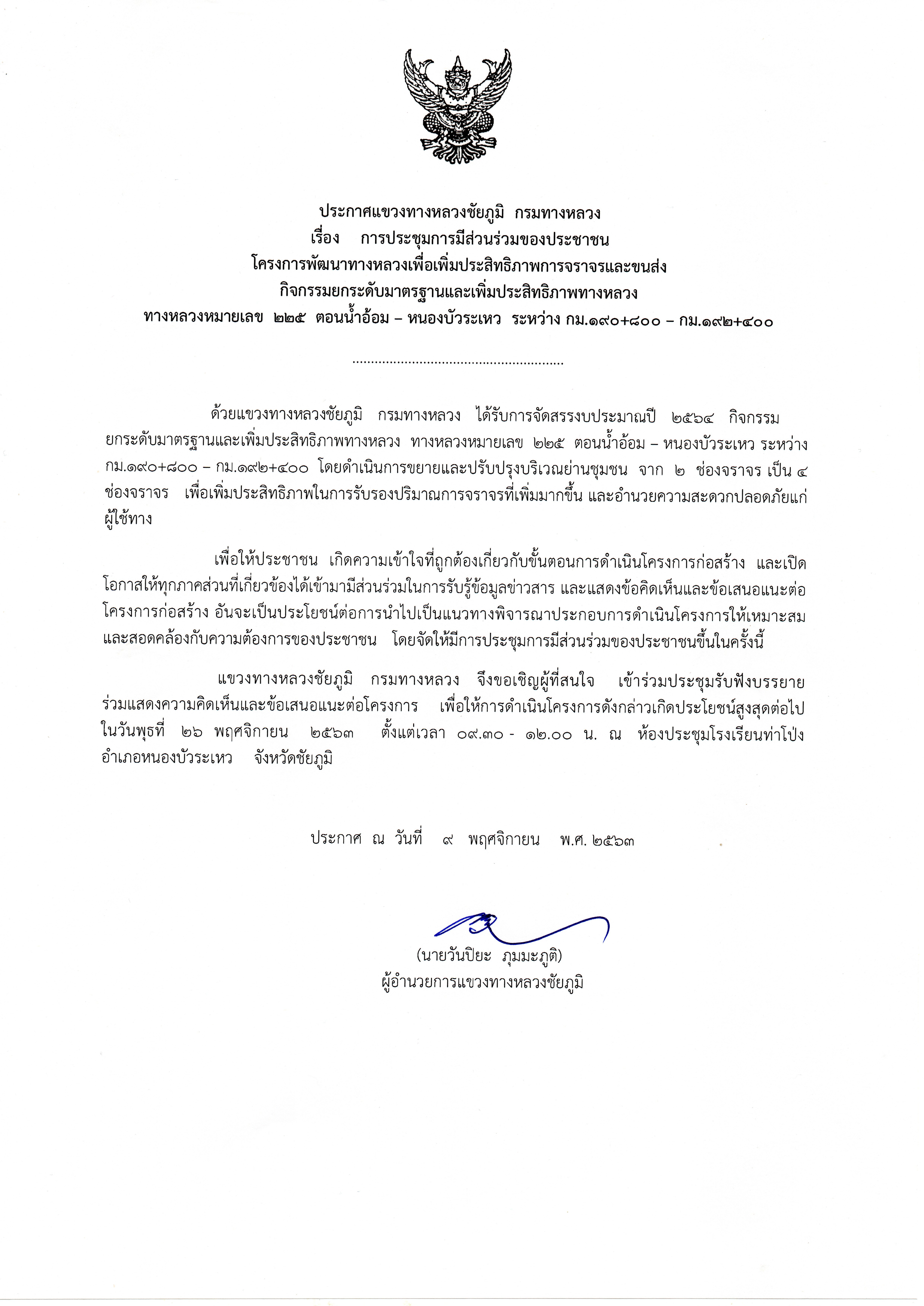 แขวงทางหลวงชัยภูมิจัดประชุมการมีส่วนร่วมของประชาชน โครงการพัฒนาทางหลวงเพื่อเพิ่มประสิทธิภาพการจราจรและขนส่ง