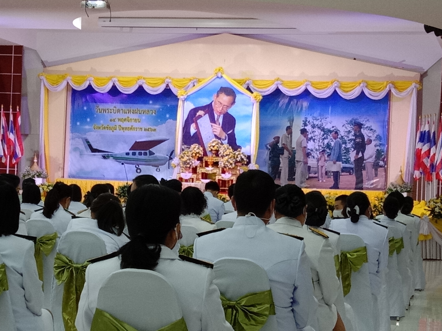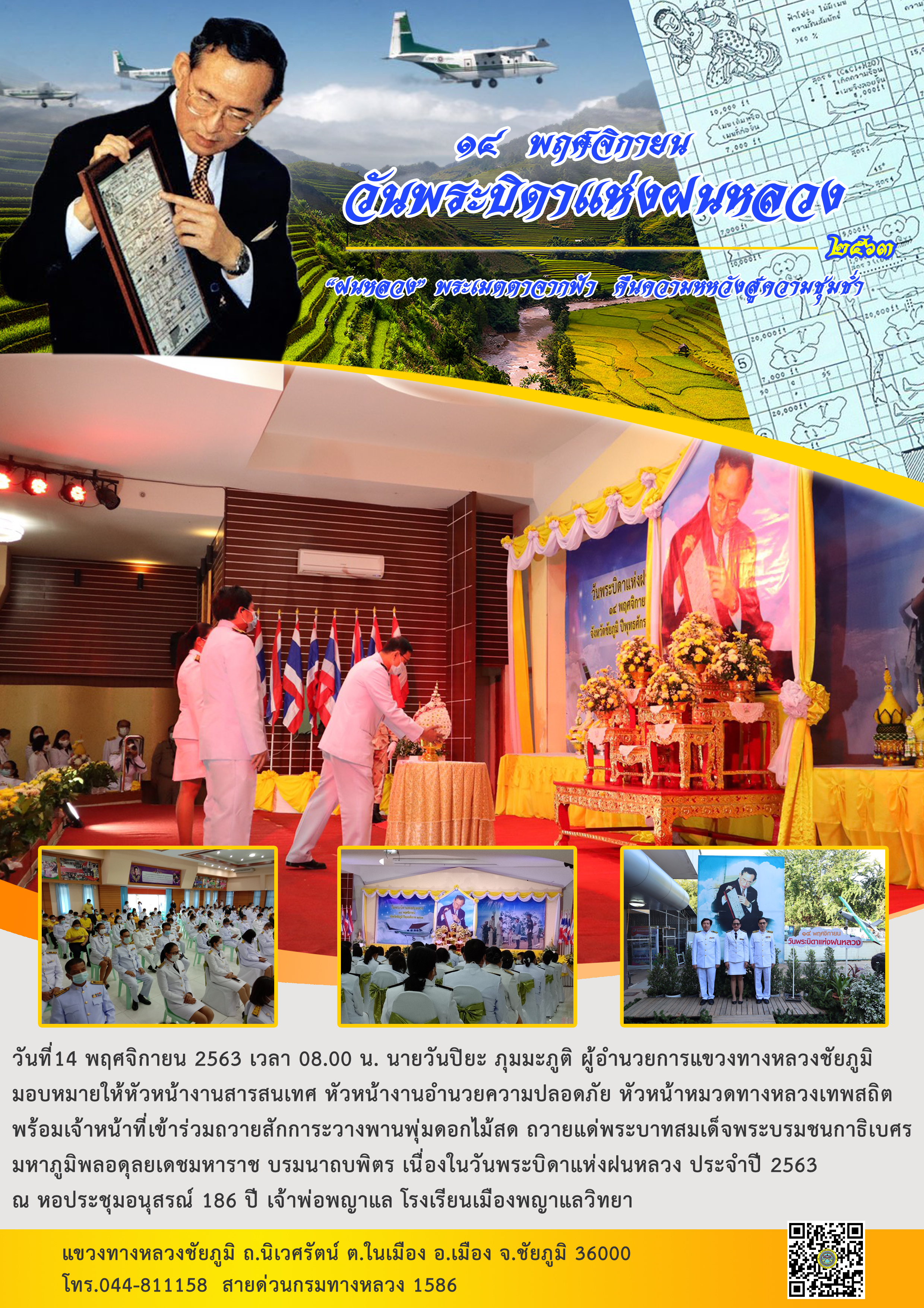 วันที่14 พฤศจิกายน 2563 เวลา 08.00 น. นายวันปิยะ ภุมมะภูติ ผู้อำนวยการแขวงทางหลวงชัยภูมิมอบหมายให้หัวหน้างานสารสนเทศ หัวหน้างานอำนวยความปลอดภัย หัวหน้าหมวดทางหลวงเทพสถิต พร้อมเจ้าหน้าที่เข้าร่วมถวายสักการะวางพานพุ่มดอกไม้สด ถวายแด่พระบาทสมเด็จพระบรมชนกาธิเบศร มหาภูมิพลอดุลยเดชมหาราช บรมนาถบพิตร เนื่องในวันพระบิดาแห่งฝนหลวง ประจำปี 2563 ณ หอประชุมอนุสรณ์ 186 ปี เจ้าพ่อพญาแล โรงเรียนเมืองพญาแลวิทยา