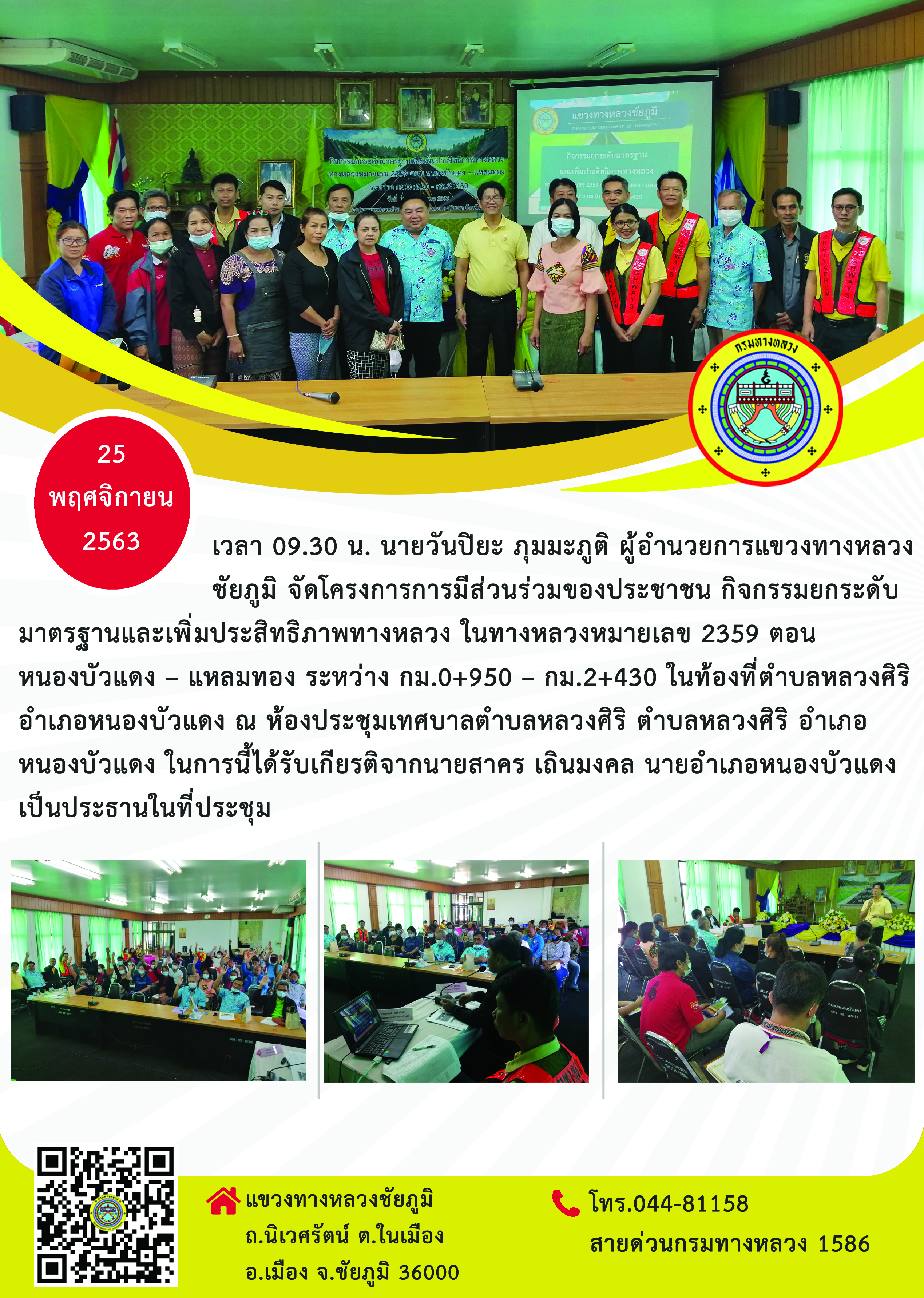 วันที่ 25 พฤศจิกายน 2563 เวลา 09.30 น. นายวันปิยะ ภุมมะภูติ ผู้อำนวยการแขวงทางหลวงชัยภูมิ จัดโครงการการมีส่วนร่วมของประชาชน กิจกรรมยกระดับมาตรฐานและเพิ่มประสิทธิภาพทางหลวง ในทางหลวงหมายเลข 2359 ตอนหนองบัวแดง – แหลมทอง ระหว่าง กม.0+950 – กม.2+430 ในท้องที่ตำบลหลวงศิริ อําเภอหนองบัวแดง ณ ห้องประชุมเทศบาลตำบลหลวงศิริ ตำบลหลวงศิริ อำเภอหนองบัวแดง ในการนี้ได้รับเกียรติจากนายสาคร เถินมงคล นายอำเภอหนองบัวแดง เป็นประธานในที่ประชุม