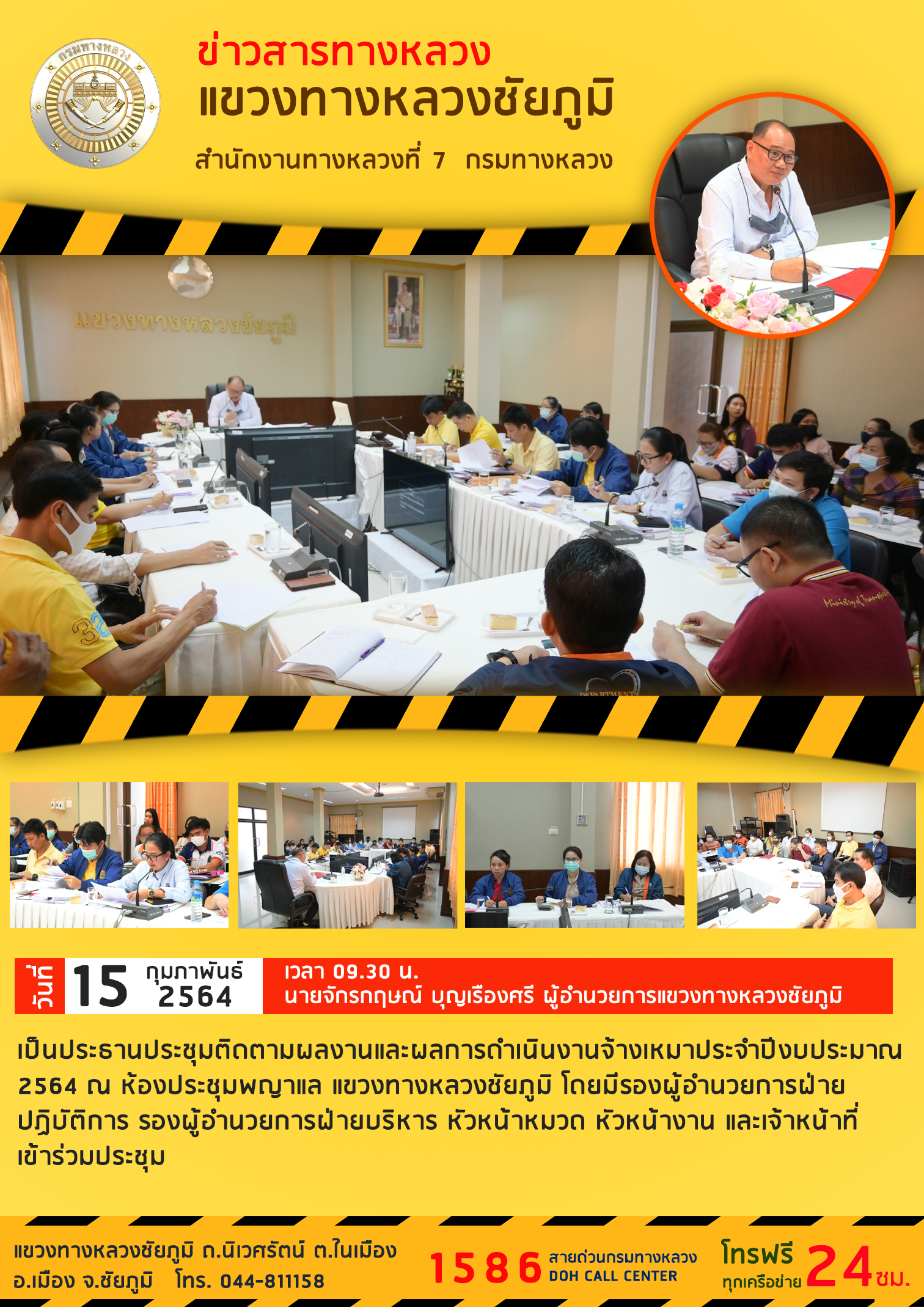 วันที่ 15 กุมภาพันธ์ 2564 เวลาประมาณ 09.30 น. นายจักรกฤษณ์ บุญเรืองศรี ผู้อำนวยการแขวงทางหลวงชัยภูมิ เป็นประธานประชุมติดตามผลงานและผลการดำเนินงานจ้างเหมาประจำปีงบประมาณ 2564 ณ ห้องประชุมพญาแล แขวงทางหลวงชัยภูมิ โดยมีรองผู้อำนวยการฝ่ายปฏิบัติการ รองผู้อำนวยการฝ่ายบริหาร หัวหน้าหมวด หัวหน้างาน และเจ้าหน้าที่ เข้าร่วมประชุม