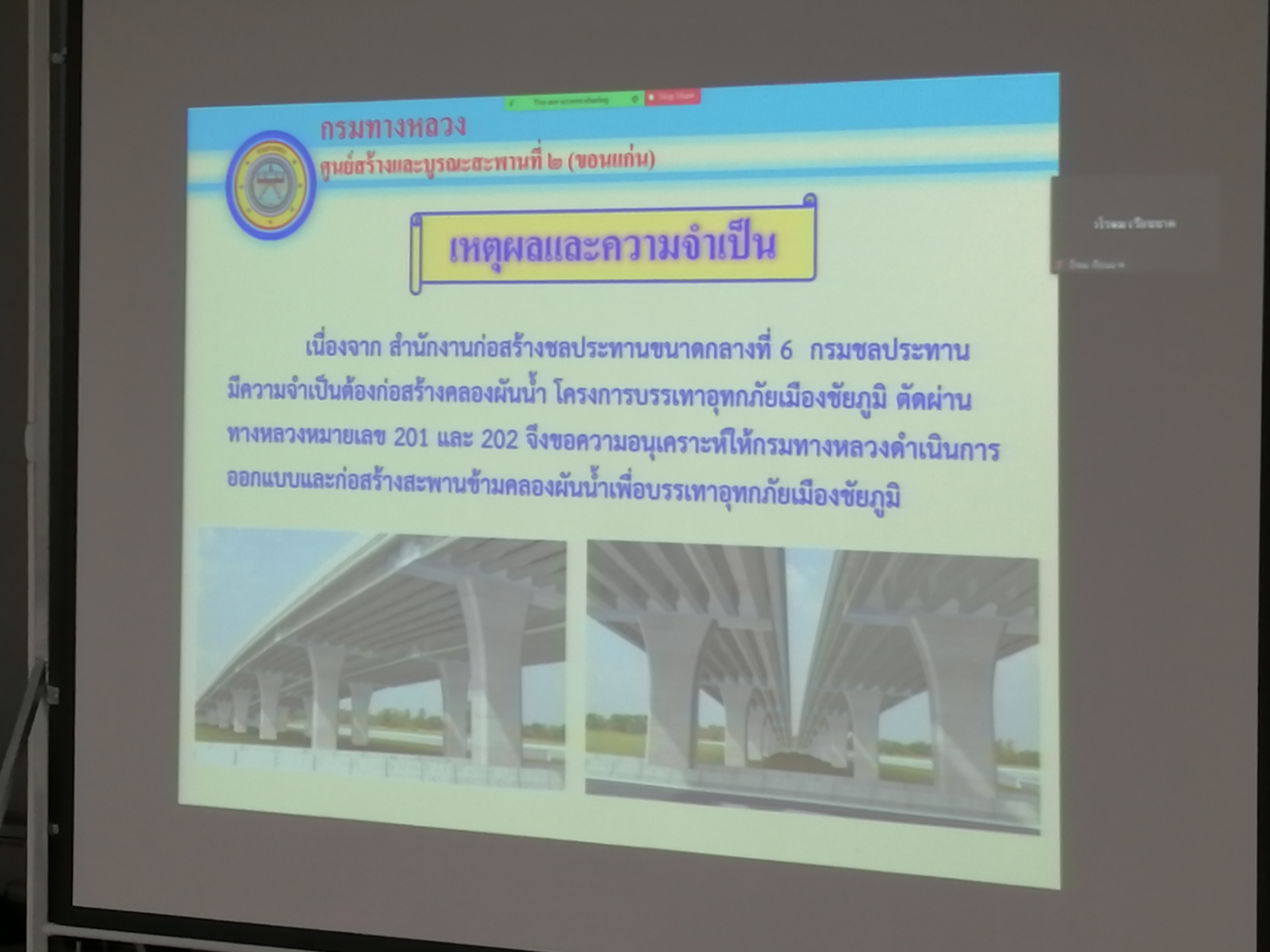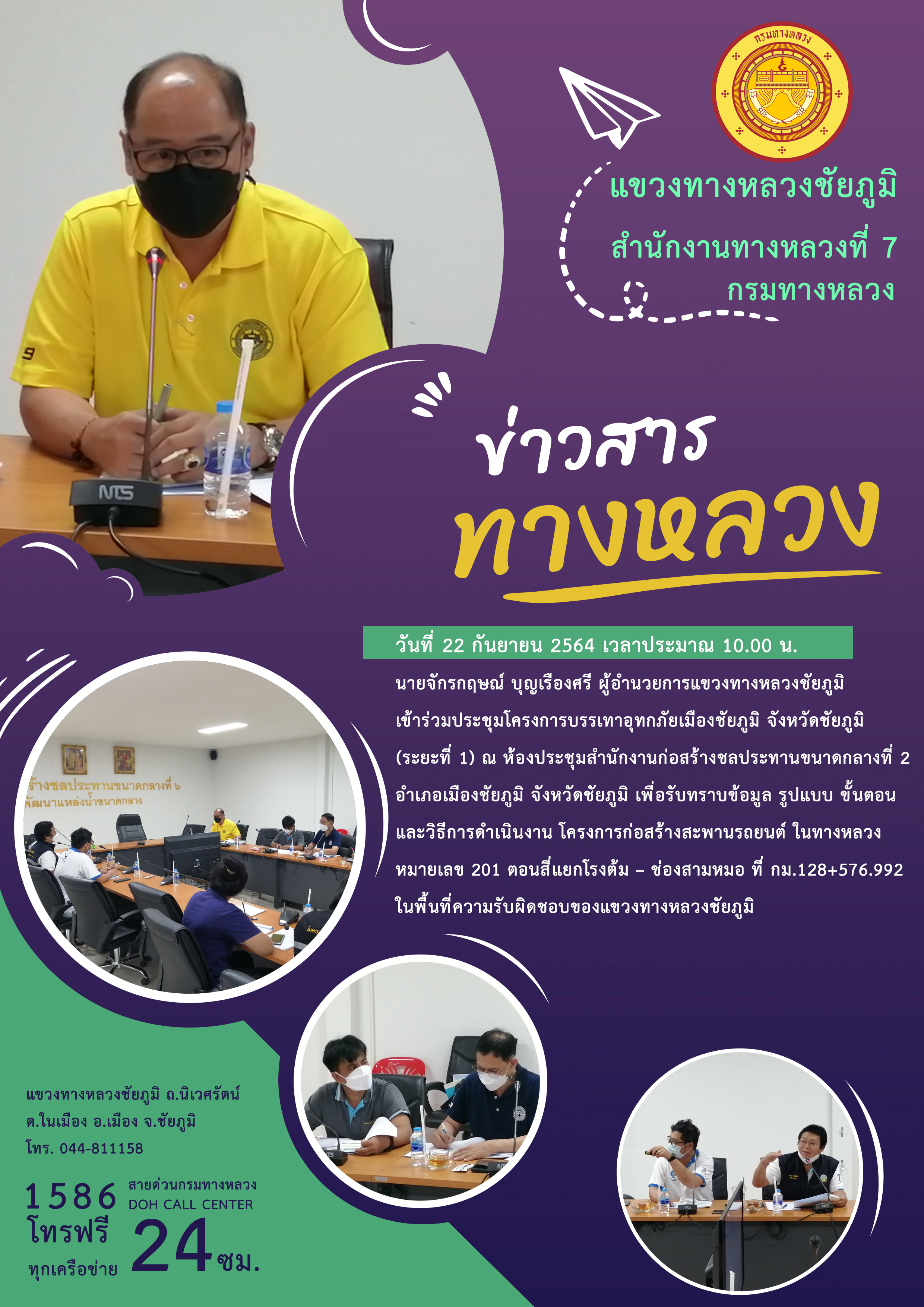 วันที่ 22 กันยายน 2564 เวลาประมาณ 10.00 น. นายจักรกฤษณ์ บุญเรืองศรี ผู้อำนวยการแขวงทางหลวงชัยภูมิ เข้าร่วมประชุมโครงการบรรเทาอุทกภัยเมืองชัยภูมิ จังหวัดชัยภูมิ (ระยะที่ 1) ณ ห้องประชุมสำนักงานก่อสร้างชลประทานขนาดกลางที่ 2 อำเภอเมืองชัยภูมิ จังหวัดชัยภูมิ เพื่อรับทราบข้อมูล รูปแบบ ขั้นตอน และวิธีการดำเนินงาน โครงการก่อสร้างสะพานรถยนต์ ในทางหลวงหมายเลข 201 ตอนสี่แยกโรงต้ม – ช่องสามหมอ ที่ กม.128+576.992 ในพื้นที่ความรับผิดชอบของแขวงทางหลวงชัยภูมิ