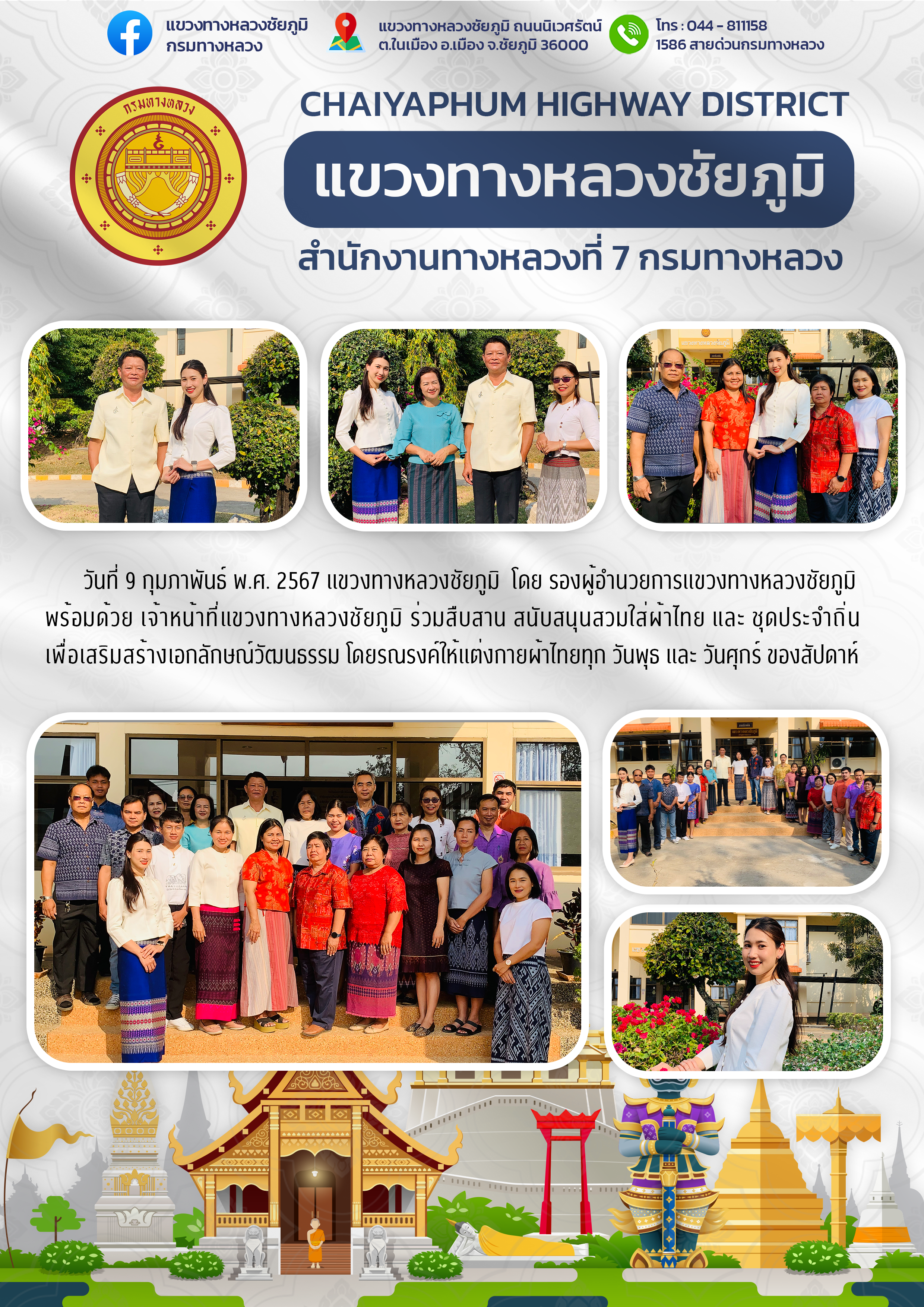 แขวงทางหลวงชัยภูมิ โดย รองผู้อำนวยการแขวงทางหลวงชัยภูมิ พร้อมด้วย เจ้าหน้าที่แขวงทางหลวงชัยภูมิ ร่วมสืบสาน สนับสนุนสวมใส่ผ้าไทย และ ชุดประจำถิ่น เพื่อเสริมสร้างเอกลักษณ์วัฒนธรรม โดยรณรงค์ให้แต่งกายผ้าไทยทุก วันพุธ และ วันศุกร์ ของสัปดาห์