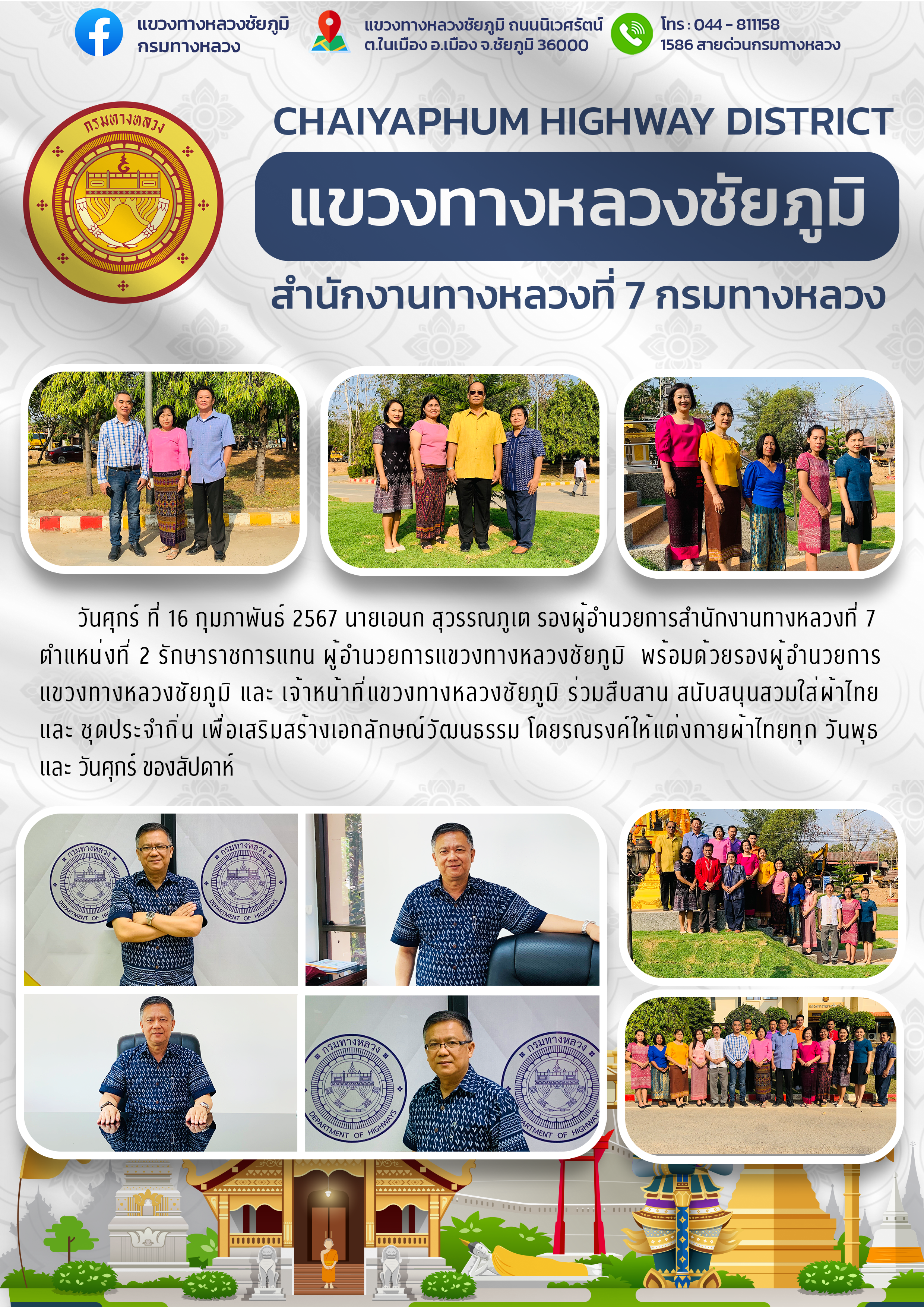 นายเอนก สุวรรณภูเต รองผู้อำนวยการสำนักงานทางหลวงที่ 7 ตำแหน่งที่ 2 รักษาราชการแทน ผู้อำนวยการแขวงทางหลวงชัยภูมิิ พร้อมด้วยรองผู้อำนวยการแขวงทางหลวงชัยภูมิ และ เจ้าหน้าที่แขวงทางหลวงชัยภูมิ ร่วมสืบสาน สนับสนุนสวมใส่ผ้าไทย และ ชุดประจำถิ่น เพื่อเสริมสร้างเอกลักษณ์วัฒนธรรม โดยรณรงค์ให้แต่งกายผ้าไทยทุก วันพุธ และ วันศุกร์ ของสัปดาห์