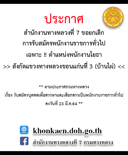 232 26/03/2564 ขอยกเลิกการประกาศรับสมัครพนักงานราชการทั่วไป เฉพาะตำแหน่งพนักงานโยธา สังกัดแขวงทางหลวงขอนแก่นที่ 3 (บ้านไผ่)