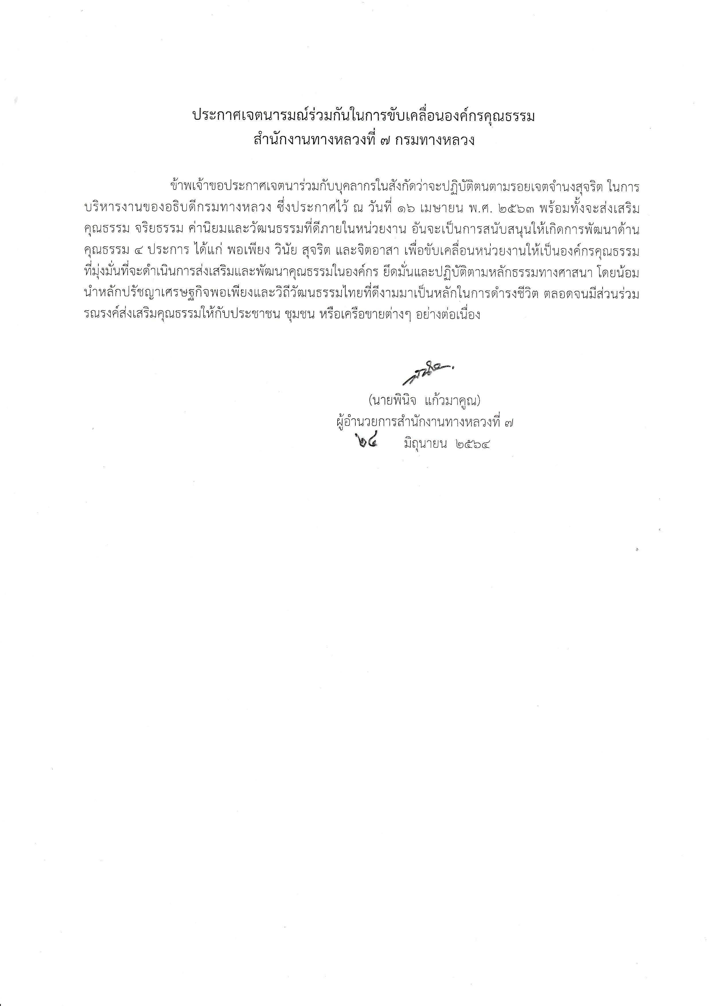 227 29/06/2564 ประกาศเจตนารมณ์ร่วมกันในการขับเคลื่อนองค์กรคุณธรรม สำนักงานทางหลวงที่ 7