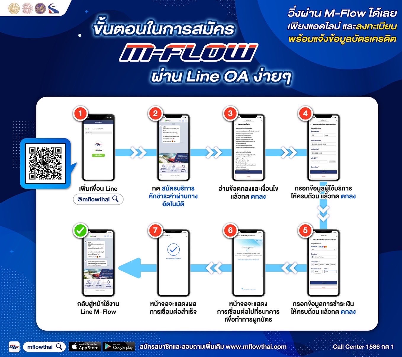 สมัครใช้บริการ M-FLOW ง่าย ๆ เพียง 2 นาที ผ่าน Line OA. เพิ่มเพื่อน @mflowthai หรือ สแกน QR Code แล้วผูกกับบัตรเครดิต