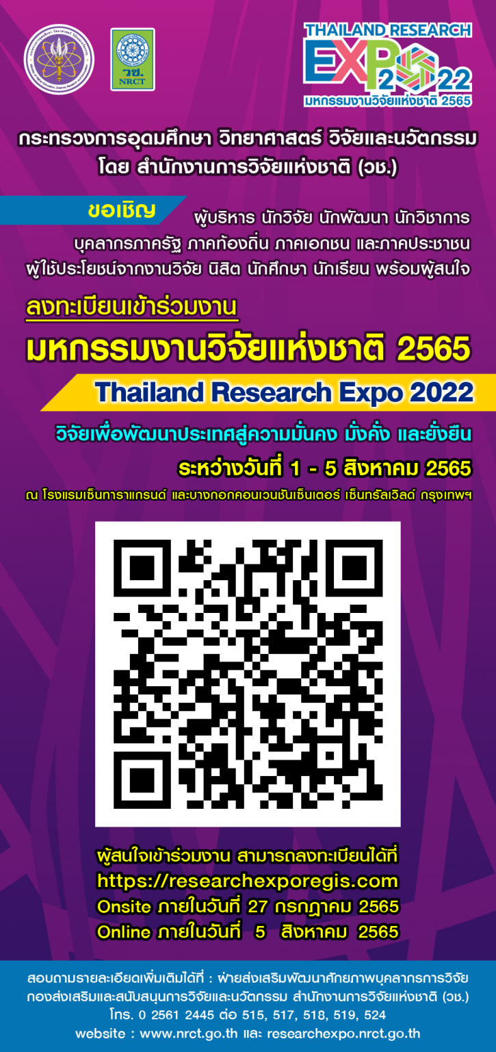 กระทรวงการอุดมศึกษา วิทยาศาสตร์ วิจัยและนวัตกรรม ร่วมกับหน่วยงานเครือข่ายในระบบวิจัยทั่วประเทศ ขอเชิญร่วมงาน มหกรรมงานวิจัยแห่งชาติ 2565 (Thailand Research Expo 2022) “วิจัยเพื่อพัฒนาประเทศสู่ความมั่นคง มั่งคั่ง และยั่งยืน”