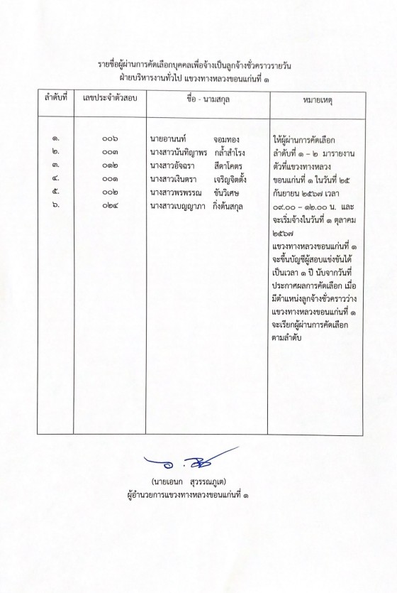 เรื่อง ประกาศรายชื่อผู้มีสิทธิ์เข้ารับการคัดเลือกบุคคลเพื่อจ้างเป็นลูกจ้างชั่วคราวรายวัน ฝ่ายบริหารงานทั่วไป และตามประกาศแขวงทางหลวงขอนแก่นที่ 1 กรมทางหลวง ลงวันที่ 25 กรกฎาคม 2567