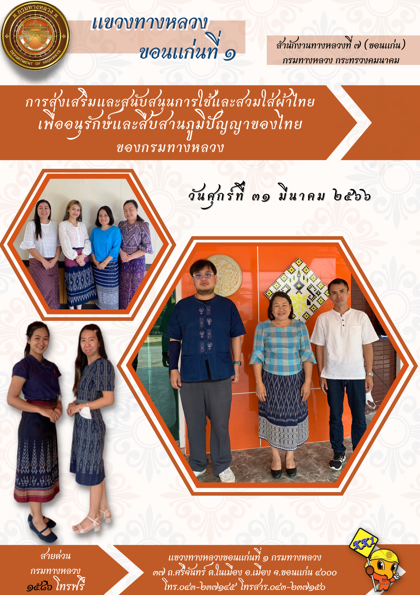 วันที่ 31 มีนาคม 2566 นายสิโรตม์ แดงภูมี ผู้อำนวยการแขวงทางหลวงขอนแก่นที่ 1 พร้อมด้วยคณะผู้บริหาร ข้าราชการ และเจ้าหน้าที่ ร่วมกันแต่งกายด้วยชุดผ้าไทย ตามมาตรการส่งเสริมและสนับสนุนการใช้และสวมใส่ผ้าไทยของกรมทางหลวง ซึ่งเป็นนโยบายของรัฐบาล เพื่อเป็นการอนุรักษ์และสืบสานภูมิปัญญาของคนไทยตามความเหมาะสมของท้องถิ่นทุกวันพุธและวันศุกร์ของสัปดาห์