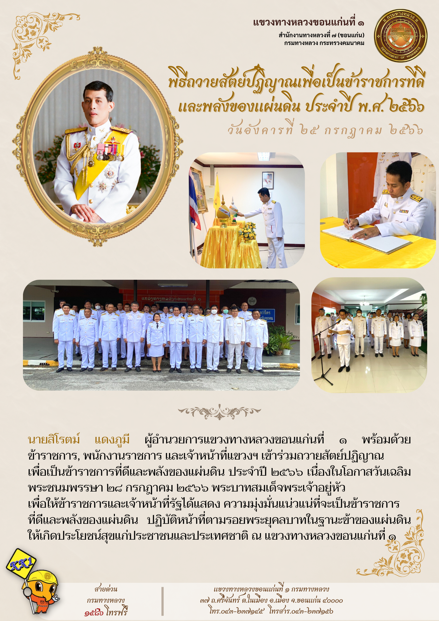วันอังคารที่ 25 กรกฎาคม 2566 เวลา 09.30 น. นายสิโรตม์ แดงภูมี ผู้อำนวยการแขวงทางหลวงขอนแก่นที่ 1 พร้อมด้วยข้าราชการ, พนักงานราชการ และเจ้าหน้าที่แขวงฯ เข้าร่วมถวายสัตย์ปฏิญาณ เพื่อเป็นข้าราชการที่ดีและพลังของแผ่นดิน ประจำปี 2566 เนื่องในโอกาสวันเฉลิมพระชนมพรรษา 28 กรกฎาคม 2566 พระบาทสมเด็จพระเจ้าอยู่หัวเพื่อให้ข้าราชการและเจ้าหน้าที่รัฐได้แสดง ความมุ่งมั่นแน่วแน่ที่จะเป็นข้าราชการที่ดี และพลังของแผ่นดิน ปฏิบัติหน้าที่ตามรอยพระยุคลบาทในฐานะข้าของแผ่นดินให้เกิดประโยชน์สุขแก่ประชาชนและประเทศชาติ ณ แขวงทางหลวงขอนแก่นที่ 1