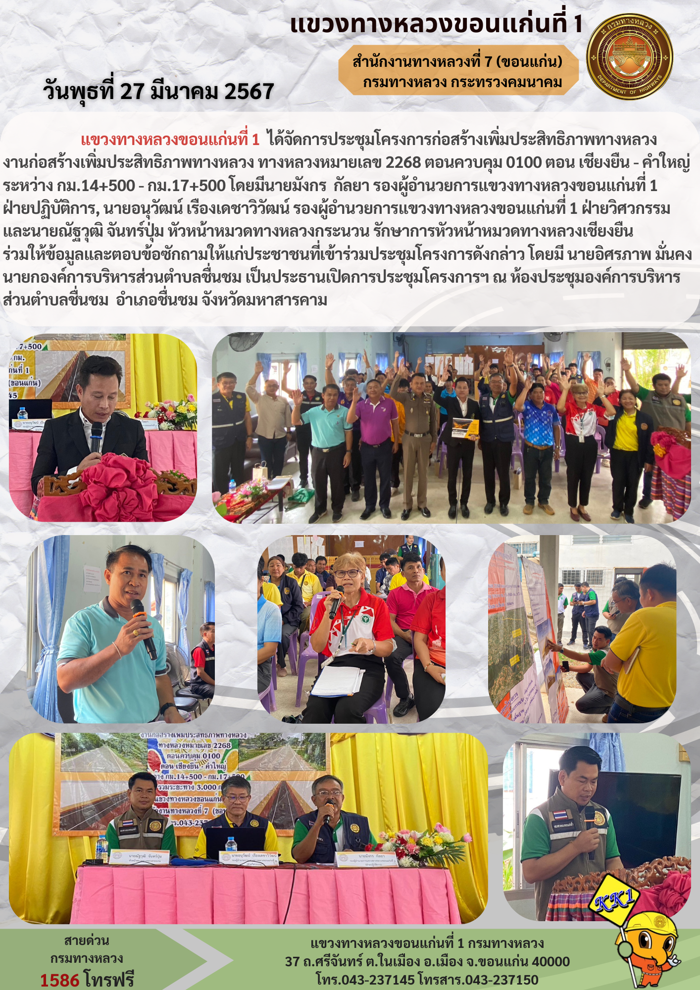 แขวงทางหลวงขอนแก่นที่ 1 ได้จัดการประชุมโครงการก่อสร้างเพิ่มประสิทธิภาพทางหลวง งานก่อสร้างเพิ่มประสิทธิภาพทางหลวง ทางหลวงหมายเลข 2268 ตอนควบคุม 0100 ตอน เชียงยืน - คำใหญ่ ระหว่าง กม.14+500 - กม.17+500 โดยมีนายมังกร กัลยา รองผู้อำนวยการแขวงทางหลวงขอนแก่นที่ 1 ฝ่ายปฏิบัติการ, นายอนุวัฒน์ เรืองเดชาวิวัฒน์ รองผู้อำนวยการแขวงทางหลวงขอนแก่นที่ 1 ฝ่ายวิศวกรรม และนายณัฐวุฒิ จันทร์ปุ่ม หัวหน้าหมวดทางหลวงกระนวน รักษาการหัวหน้าหมวดทางหลวงเชียงยืน ร่วมให้ข้อมูลและตอบข้อซักถามให้แก่ประชาชนที่เข้าร่วมประชุมโครงการดังกล่าว โดยมี นายอิศรภาพ มั่นคง นายกองค์การบริหารส่วนตำบลชื่นชม เป็นประธานเปิดการประชุมโครงการฯ ณ ห้องประชุมองค์การบริหาร ส่วนตำบลชื่นชม อำเภอชื่นชม จังหวัดมหาสารคาม