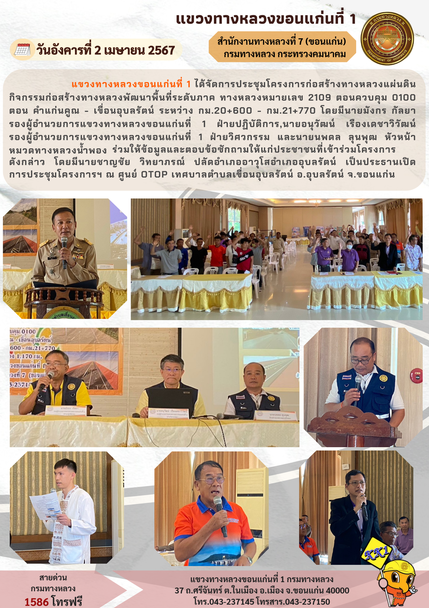 แขวงทางหลวงขอนแก่นที่ 1 ได้จัดการประชุมโครงการก่อสร้างทางหลวงแผ่นดินกิจกรรมก่อสร้างทางหลวงพัฒนาพื้นที่ระดับภาค ทางหลวงหมายเลข 2109 ตอนควบคุม 0100 ตอน คำแก่นคูณ - เขื่อนอุบลรัตน์ ระหว่าง กม.20+600 - กม.21+770 โดยมีนายมังกร กัลยา รองผู้อำนวยการแขวงทางหลวงขอนแก่นที่ 1 ฝ่ายปฏิบัติการ,นายอนุวัฒน์ เรืองเดชาวิวัฒน์ รองผู้อำนวยการแขวงทางหลวงขอนแก่นที่ 1 ฝ่ายวิศวกรรม และนายนพดล ลุนพุฒ หัวหน้าหมวดทางหลวงน้ำพอง ร่วมให้ข้อมูลและตอบข้อซักถามให้แก่ประชาชนที่เข้าร่วมโครงการดังกล่าว โดยมีนายชาญชัย วิทยาภรณ์ ปลัดอำเภออาวุโสอำเภออุบลรัตน์ เป็นประธานเปิด การประชุมโครงการฯ ณ ศูนย์ OTOP เทศบาลตำบลเขื่อนอุบลรัตน์ อ.อุบลรัตน์ จ.ขอนแก่น
