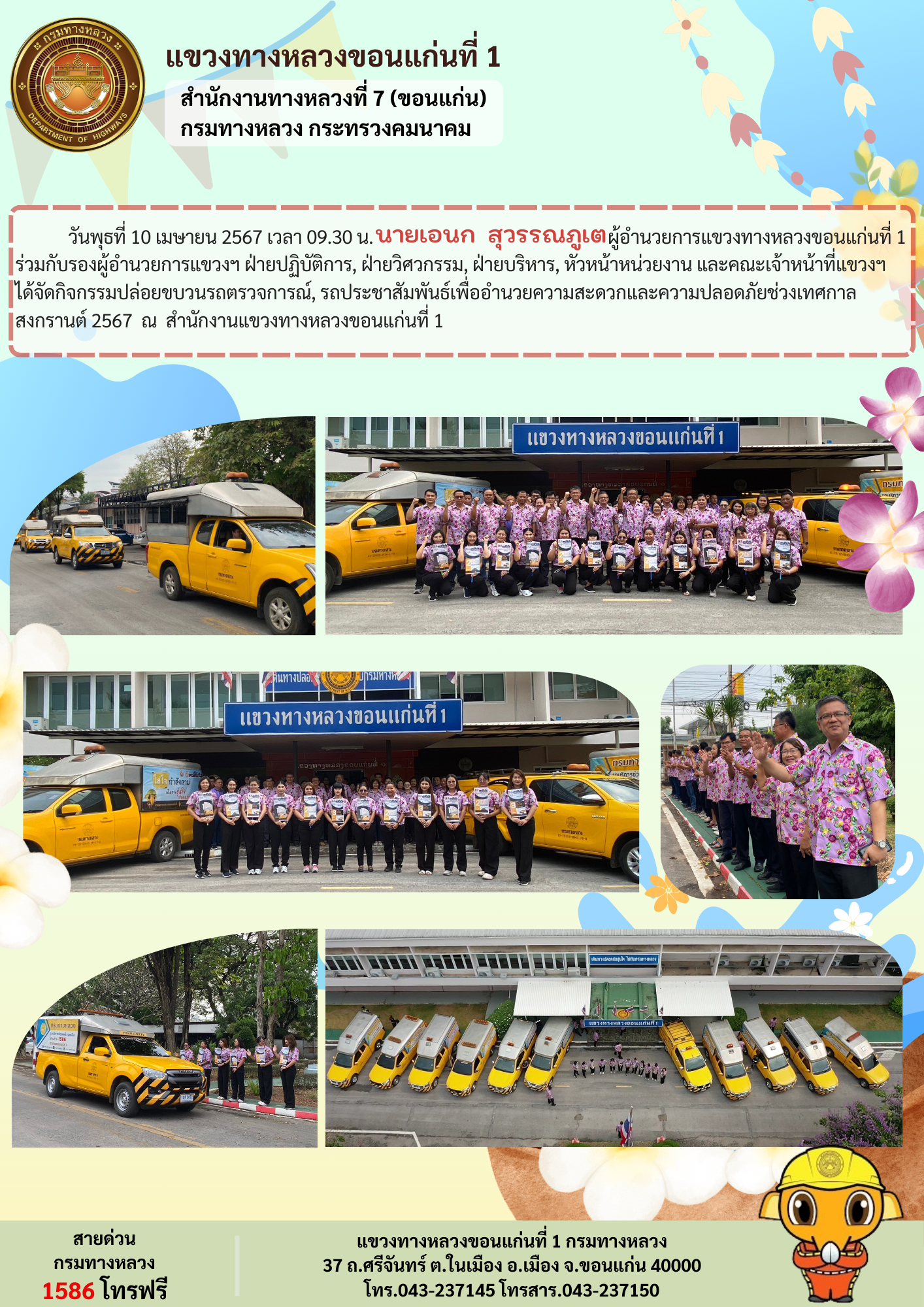วันพุธที่ 10 เมษายน 2567 เวลา 09.30 น. นายเอนก สุวรรณภูเต ผู้อำนวยการแขวงทางหลวงขอนแก่นที่ 1 ร่วมกับรองผู้อำนวยการแขวงฯ ฝ่ายปฏิบัติการ, ฝ่ายวิศวกรรม, ฝ่ายบริหาร, หัวหน้าหน่วยงาน และคณะเจ้าหน้าที่แขวงฯ ได้จัดกิจกรรมปล่อยขบวนรถตรวจการณ์, รถประชาสัมพันธ์เพื่ออำนวยความสะดวกและความปลอดภัยช่วงเทศกาลสงกรานต์ 2567 ณ สำนักงานแขวงทางหลวงขอนแก่นที่ 1