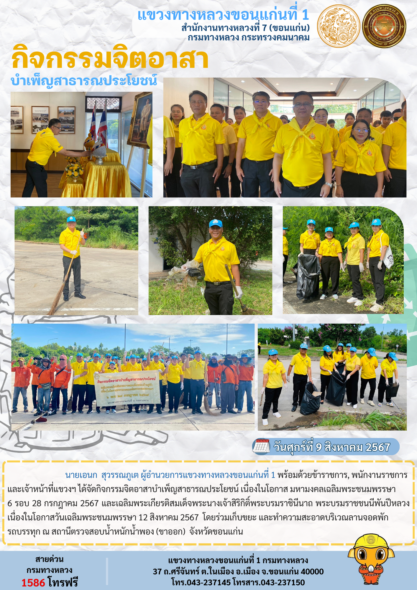 นายเอนก สุวรรณภูเต ผู้อำนวยการแขวงทางหลวงขอนแก่นที่ 1 พร้อมด้วยข้าราชการ, พนักงานราชการ และเจ้าหน้าที่แขวงฯ ได้จัดกิจกรรมจิตอาสาบำเพ็ญสาธารณประโยชน์ เนื่องในโอกาส มหามงคลเฉลิมพระชนมพรรษา 6 รอบ 28 กรกฎาคม 2567 และเฉลิมพระเกียรติสมเด็จพระนางเจ้าสิริกิติ์พระบรมราชินีนาถ พระบรมราชชนนีพันปีหลวง เนื่องในโอกาสวันเฉลิมพระชนมพรรษา 12 สิงหาคม 2567 โดยร่วมเก็บขยะ และทำความสะอาดบริเวณลานจอดพักรถบรรทุก ณ สถานีตรวจสอบน้ำหนักน้ำพอง (ขาออก) จังหวัดขอนแก่น