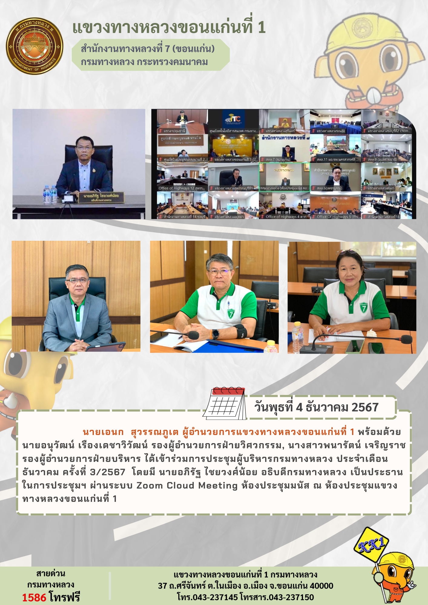 นายเอนก สุวรรณภูเต ผู้อำนวยการแขวงทางหลวงขอนแก่นที่ 1 พร้อมด้วยนายอนุวัฒน์ เรืองเดชาวิวัฒน์ รองผู้อำนวยการฝ่ายวิศวกรรม, นางสาวพนารัตน์ เจริญราช รองผู้อำนวยการฝ่ายบริหาร ได้เข้าร่วมการประชุมผู้บริหารกรมทางหลวง ประจำเดือนธันวาคม ครั้งที่ 3/2567 โดยมี นายอภิรัฐ ไชยวงศ์น้อย อธิบดีกรมทางหลวง เป็นประธานในการประชุมฯ ผ่านระบบ Zoom Cloud Meeting ห้องประชุมมนัส ณ ห้องประชุมแขวงทางหลวงขอนแก่นที่ 1
