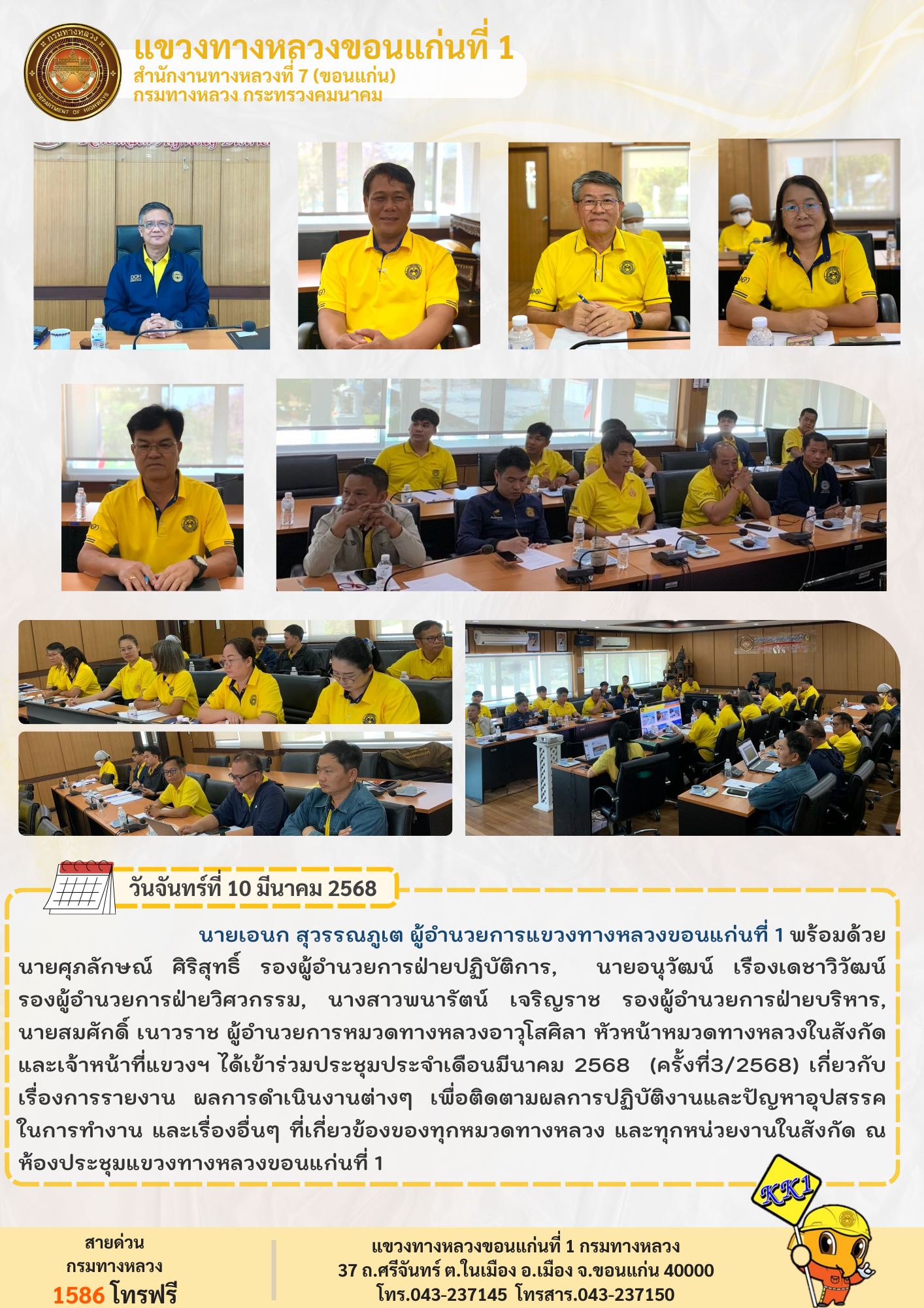 นายเอนก สุวรรณภูเต ผู้อำนวยการแขวงทางหลวงขอนแก่นที่ 1 พร้อมด้วยนายศุภลักษณ์ ศิริสุทธิ์ รองผู้อำนวยการฝ่ายปฏิบัติการ, นายอนุวัฒน์ เรืองเดชาวิวัฒน์ รองผู้อำนวยการฝ่ายวิศวกรรม, นางสาวพนารัตน์ เจริญราช รองผู้อำนวยการฝ่ายบริหาร, นายสมศักดิ์ เนาวราช ผู้อำนวยการหมวดทางหลวงอาวุโสศิลา หัวหน้าหมวดทางหลวงในสังกัด และเจ้าหน้าที่แขวงฯ ได้เข้าร่วมประชุมประจำเดือนมีนาคม 2568 (ครั้งที่3/2568) เกี่ยวกับเรื่องการรายงาน ผลการดำเนินงานต่างๆ เพื่อติดตามผลการปฏิบัติงานและปัญหาอุปสรรคในการทำงาน และเรื่องอื่นๆ ที่เกี่ยวข้องของทุกหมวดทางหลวง และทุกหน่วยงานในสังกัด ณ ห้องประชุมแขวงทางหลวงขอนแก่นที่ 1