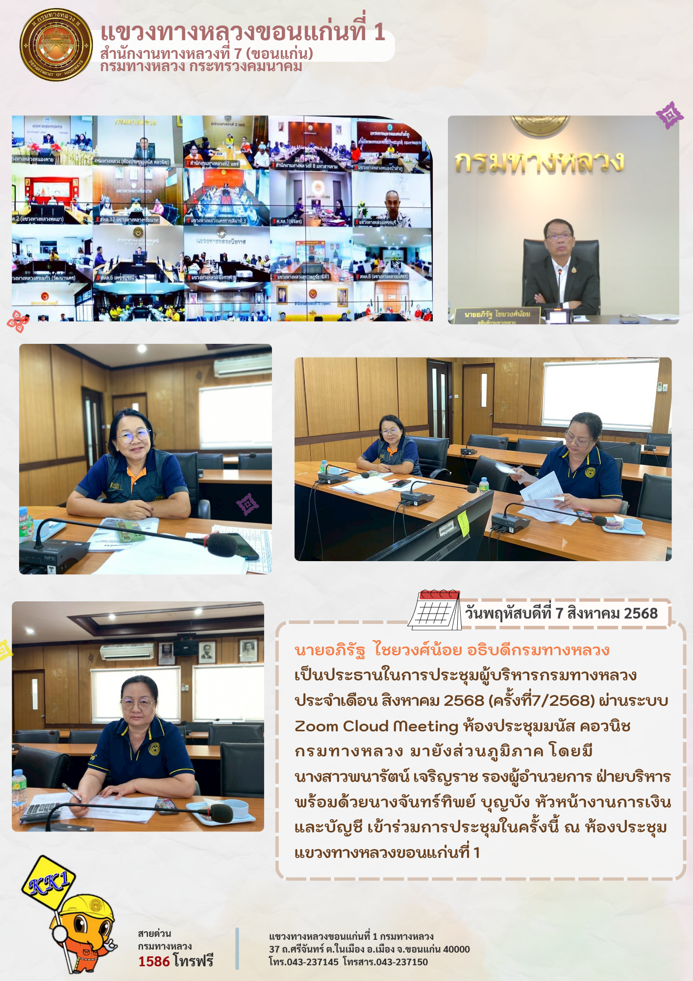 นายอภิรัฐ ไชยวงศ์น้อย อธิบดีกรมทางหลวง เป็นประธานในการประชุมผู้บริหารกรมทางหลวงประจำเดือน สิงหาคม 2568 (ครั้งที่7/2568) ผ่านระบบ Zoom Cloud Meeting ห้องประชุมมนัส คอวนิช กรมทางหลวง มายังส่วนภูมิภาค โดยมี นางสาวพนารัตน์ เจริญราช รองผู้อำนวยการ ฝ่ายบริหาร พร้อมด้วยนางจันทร์ทิพย์ บุญบัง หัวหน้างานการเงินและบัญชี เข้าร่วมการประชุมในครั้งนี้ ณ ห้องประชุมแขวงทางหลวงขอนแก่นที่ 1