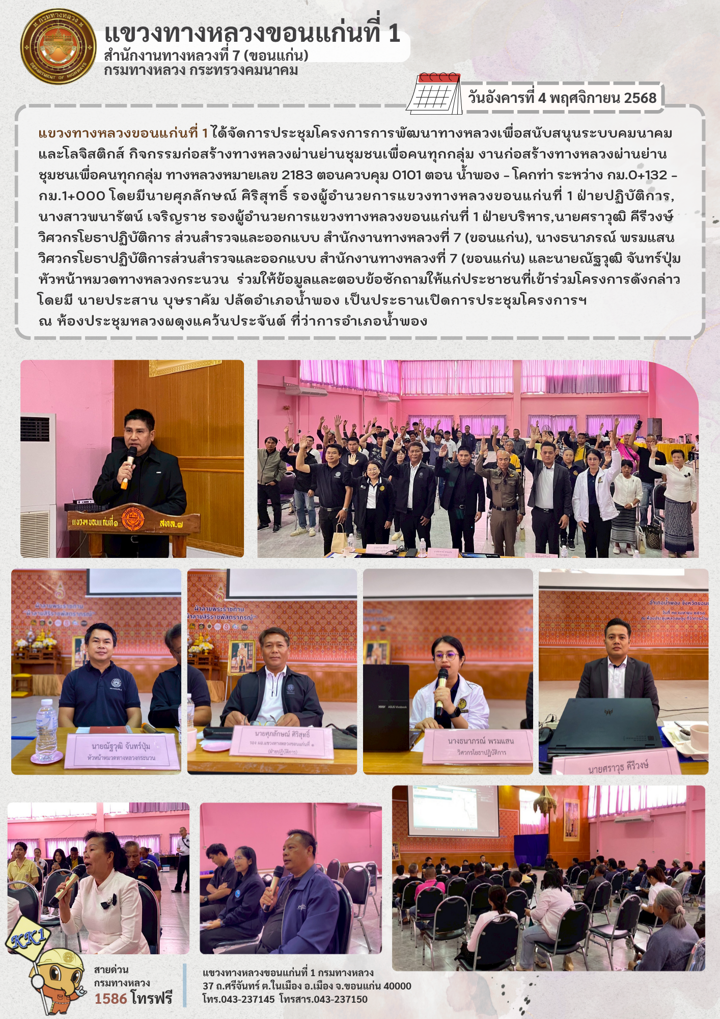 แขวงทางหลวงขอนแก่นที่ 1 ได้จัดการประชุมโครงการการพัฒนาทางหลวงเพื่อสนับสนุนระบบคมนาคมและโลจิสติกส์ กิจกรรมก่อสร้างทางหลวงผ่านย่านชุมชนเพื่อคนทุกกลุ่ม งานก่อสร้างทางหลวงผ่านย่านชุมชนเพื่อคนทุกกลุ่ม ทางหลวงหมายเลข 2183 ตอนควบคุม 0101 ตอน น้ำพอง - โคกท่า ระหว่าง กม.0+132 - กม.1+000 โดยมีนายศุภลักษณ์ ศิริสุทธิ์ รองผู้อำนวยการแขวงทางหลวงขอนแก่นที่ 1 ฝ่ายปฏิบัติการ, นางสาวพนารัตน์ เจริญราช รองผู้อำนวยการแขวงทางหลวงขอนแก่นที่ 1 ฝ่ายบริหาร,นายศราวุฒิ คีรีวงษ์ วิศวกรโยธาปฏิบัติการ ส่วนสำรวจและออกแบบ สำนักงานทางหลวงที่ 7 (ขอนแก่น), นางธนาภรณ์ พรมแสน วิศวกรโยธาปฏิบัติการส่วนสำรวจและออกแบบ สำนักงานทางหลวงที่ 7 (ขอนแก่น) และนายณัฐวุฒิ จันทร์ปุ่ม หัวหน้าหมวดทางหลวงกระนวน ร่วมให้ข้อมูลและตอบข้อซักถามให้แก่ประชาชนที่เข้าร่วมโครงการดังกล่าว โดยมี นายประสาน บุษราคัม ปลัดอำเภอน้ำพอง เป็นประธานเปิดการประชุมโครงการฯ ณ ห้องประชุมหลวงผดุงแคว้นประจันต์ ที่ว่าการอำเภอน้ำพอง