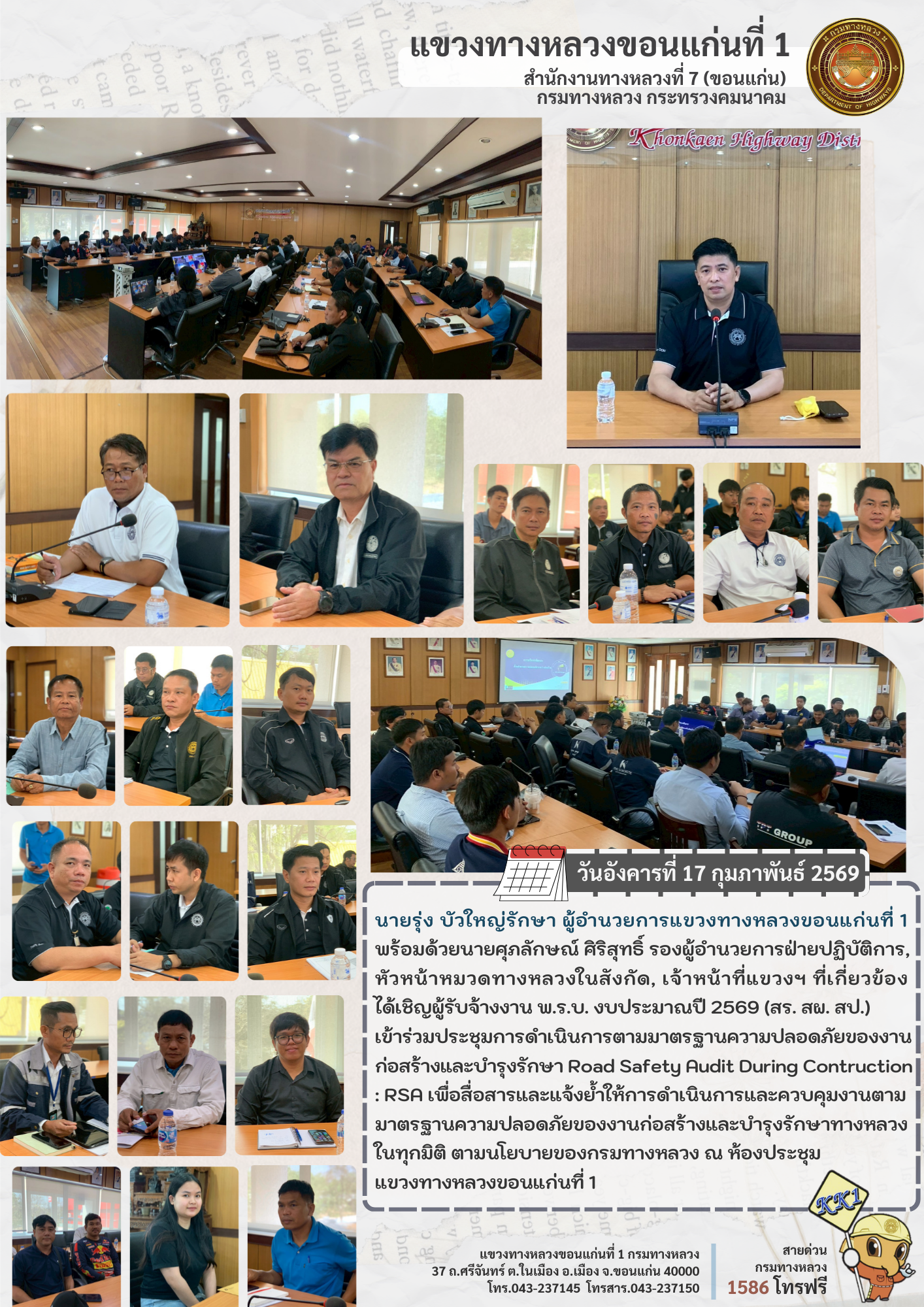 วันอังคารที่ 17 กุมภาพันธ์ 2569 เวลา 09.30 น. นายรุ่ง บัวใหญ่รักษา ผู้อำนวยการแขวงทางหลวงขอนแก่นที่ 1 พร้อมด้วยนายศุภลักษณ์ ศิริสุทธิ์ รองผู้อำนวยการฝ่ายปฏิบัติการ, หัวหน้าหมวดทางหลวงในสังกัด, เจ้าหน้าที่แขวงฯ ที่เกี่ยวข้องได้เชิญผู้รับจ้างงาน พ.ร.บ. งบประมาณปี 2569 (สร. สผ. สป.) เข้าร่วมประชุมการดำเนินการตามมาตรฐานความปลอดภัยของงานก่อสร้างและบำรุงรักษา Road Safety Audit During Contruction : RSA เพื่อสื่อสารและแจ้งย้ำให้การดำเนินการและควบคุมงานตามมาตรฐานความปลอดภัยของงานก่อสร้างและบำรุงรักษาทางหลวงในทุกมิติ ตามนโยบายของกรมทางหลวง ณ ห้องประชุมแขวงทางหลวงขอนแก่นที่ 1