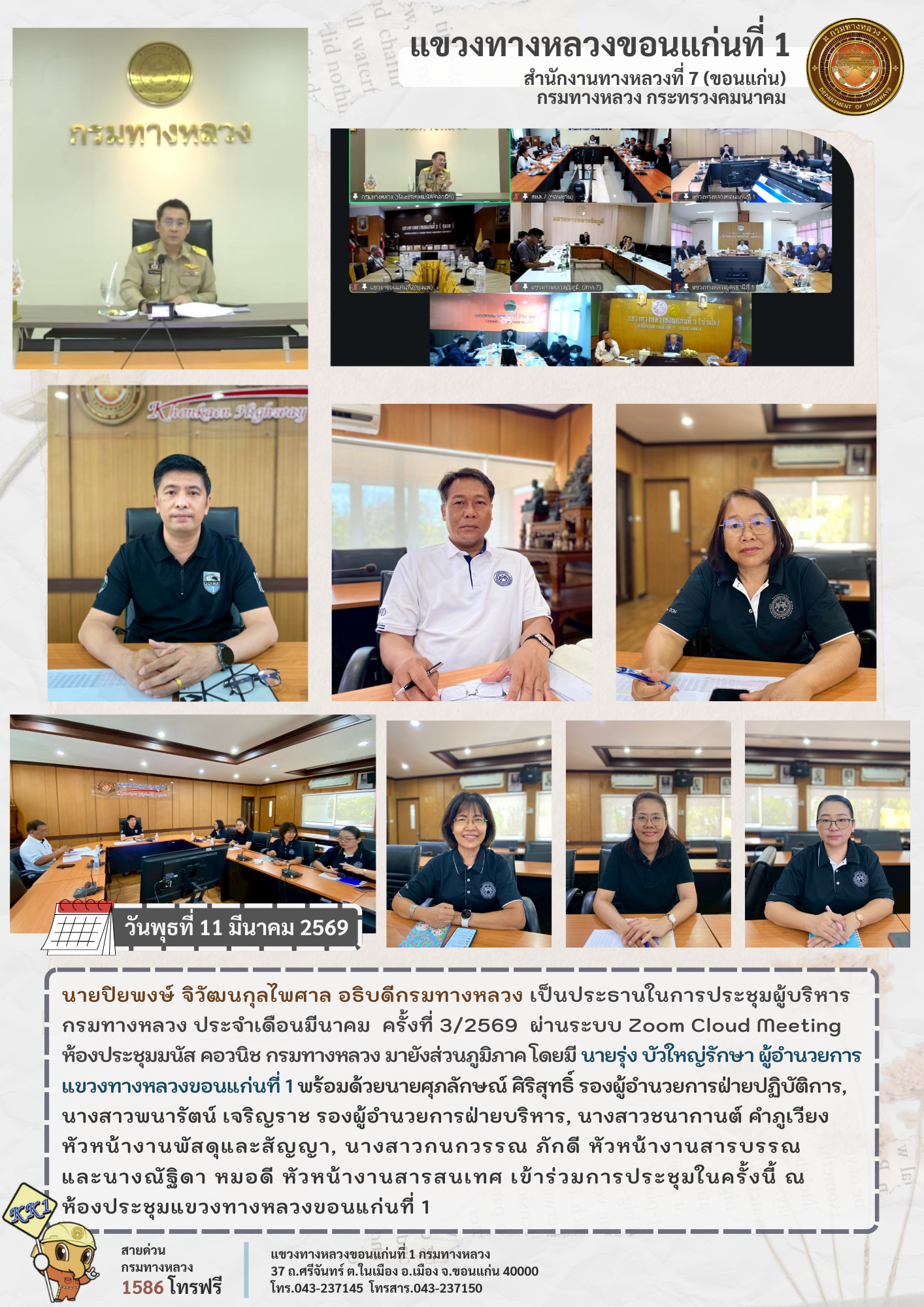 นายปิยพงษ์ จิวัฒนกุลไพศาล อธิบดีกรมทางหลวง เป็นประธานในการประชุมผู้บริหารกรมทางหลวง ประจำเดือนมีนาคม ครั้งที่ 3/2569 ผ่านระบบ Zoom Cloud Meeting ห้องประชุมมนัส คอวนิช กรมทางหลวง มายังส่วนภูมิภาค โดยมี นายรุ่ง บัวใหญ่รักษา ผู้อำนวยการแขวงทางหลวงขอนแก่นที่ 1 พร้อมด้วยนายศุภลักษณ์ ศิริสุทธิ์ รองผู้อำนวยการฝ่ายปฏิบัติการ, นางสาวพนารัตน์ เจริญราช รองผู้อำนวยการฝ่ายบริหาร, นางสาวชนากานต์ คำภูเวียง หัวหน้างานพัสดุและสัญญา, นางสาวกนกวรรณ ภักดี หัวหน้างานสารบรรณ และนางณัฐิดา หมอดี หัวหน้างานสารสนเทศ เข้าร่วมการประชุมในครั้งนี้ ณ ห้องประชุมแขวงทางหลวงขอนแก่นที่ 1