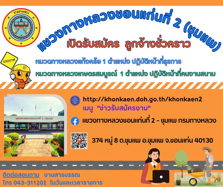 ด้วยแขวงทางหลวงขอนแก่นที่ 2 (ชุมแพ) สังกัดสำนักงานทางหลวงที่ 7 มีความประสงค์จะดำเนินการรับสมัครสอบคัดเลือกบุคคลเพื่อจ้างเป็นลูกจ้างชั่วคราวรายวัน ตำแหน่งคนงาน