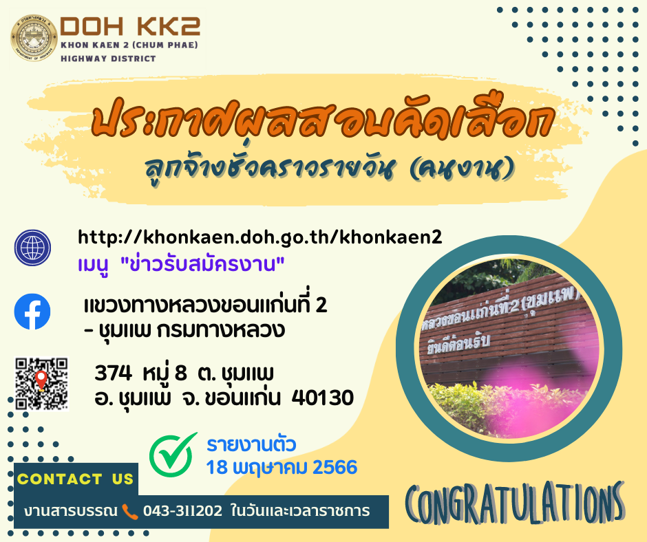 ตามที่แขวงทางหลวงขอนแก่นที่ 2 (ชุมแพ) ได้ดำเนินการประกาศรับสมัครเพื่อสอบคัดเลือกลูกจ้าง