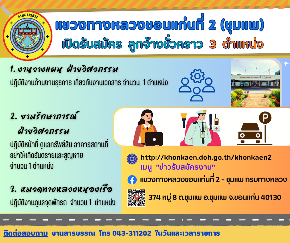 แขวงทางหลวงขอนแก่นที่ 2 (ชุมแพ) ประกาศรับสมัครบุคคล เพื่อสอบคัดเลือกจ้างเป็นลูกจ้างชั่วคราว (รายวัน) ทั้งหมด 3 ตำแหน่ง ดังนี้