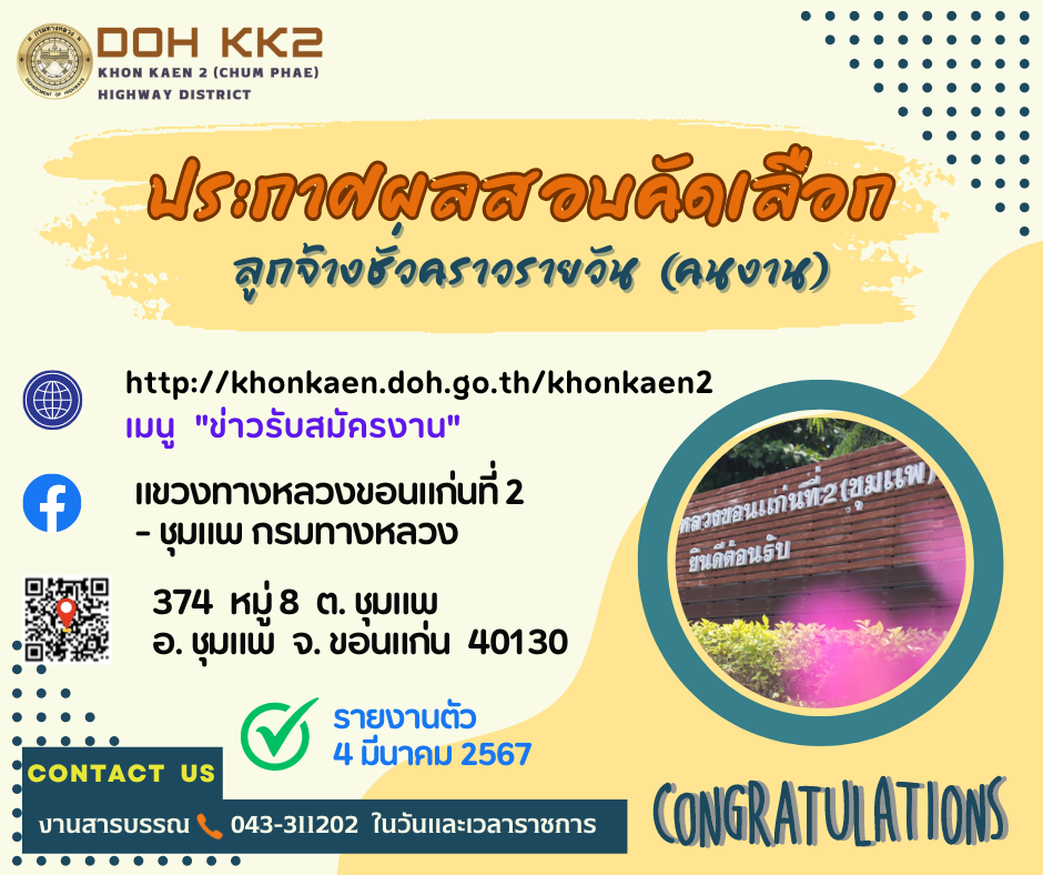 ตามที่แขวงทางหลวงขอนแก่นที่ 2 (ชุมแพ) ได้ดำเนินการรับสมัครคัดเลือกลูกจ้างชั่วคราวรายวันตามประกาศที่รับสมัคร ลงวันที่ 13 กุมภาพันธ์ 2567 จำนวน 1 อัตรา ปฏิบัติงาน ดูแลจุดพักรถ หมวดทางหลวงหนองเรือ แขวงทางหลวงขอนแก่นที่ 2 (ชุมแพ) นั้น