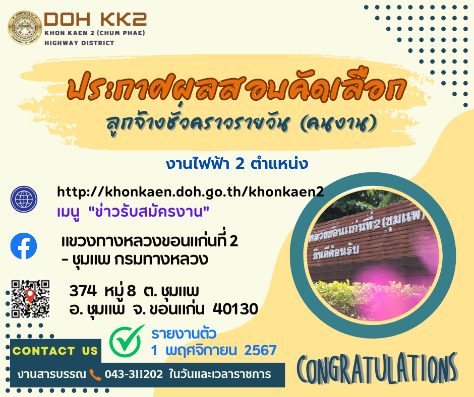 ตามประกาศที่รับสมัคร ลงวันที่ ๑ ตุลาคม ๒๕๖๗ จำนวน ๒ อัตรา ปฏิบัติงานงานไฟฟ้า แขวงทางหลวงขอนแก่นที่ ๒ (ชุมแพ) นั้น