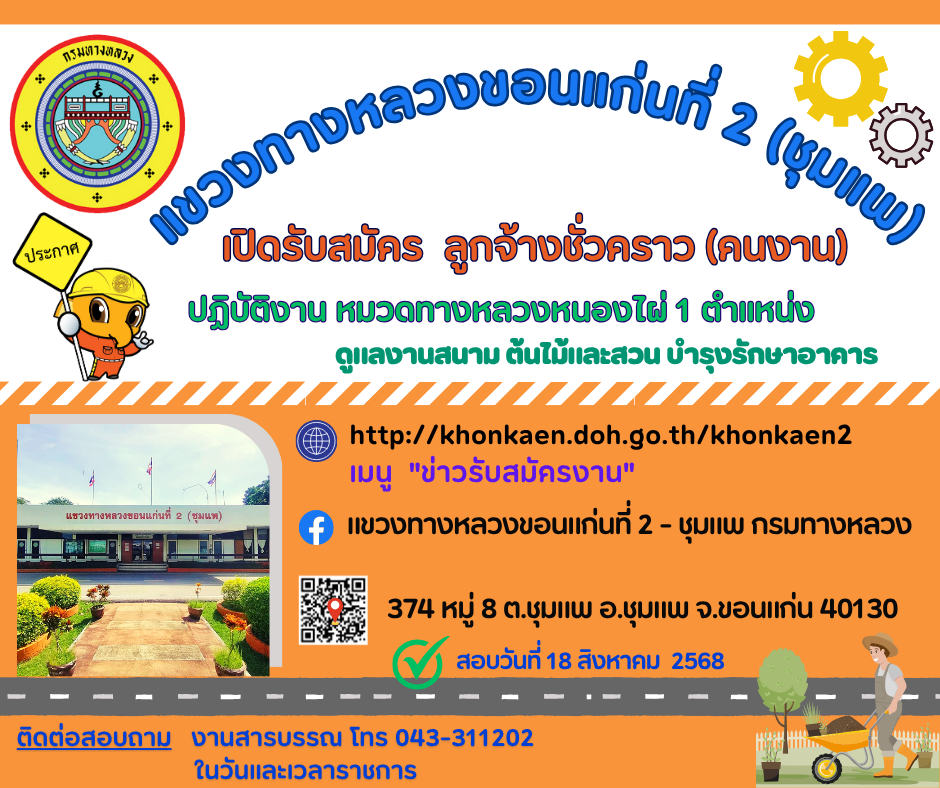 แขวงทางหลวงขอนแก่นที่ 2 (ชุมแพ) ประกาศรับสมัครบุคคล เพื่อสอบคัดเลือกจ้างเป็นลูกจ้างชั่วคราว (รายวัน) ตำแหน่ง คนงาน ปฎิบัติงานหมวดทางหลวงหนองไผ่ จำนวน 1 ตำแหน่ง ตามรายละเอียดตามเอกสารแนบ