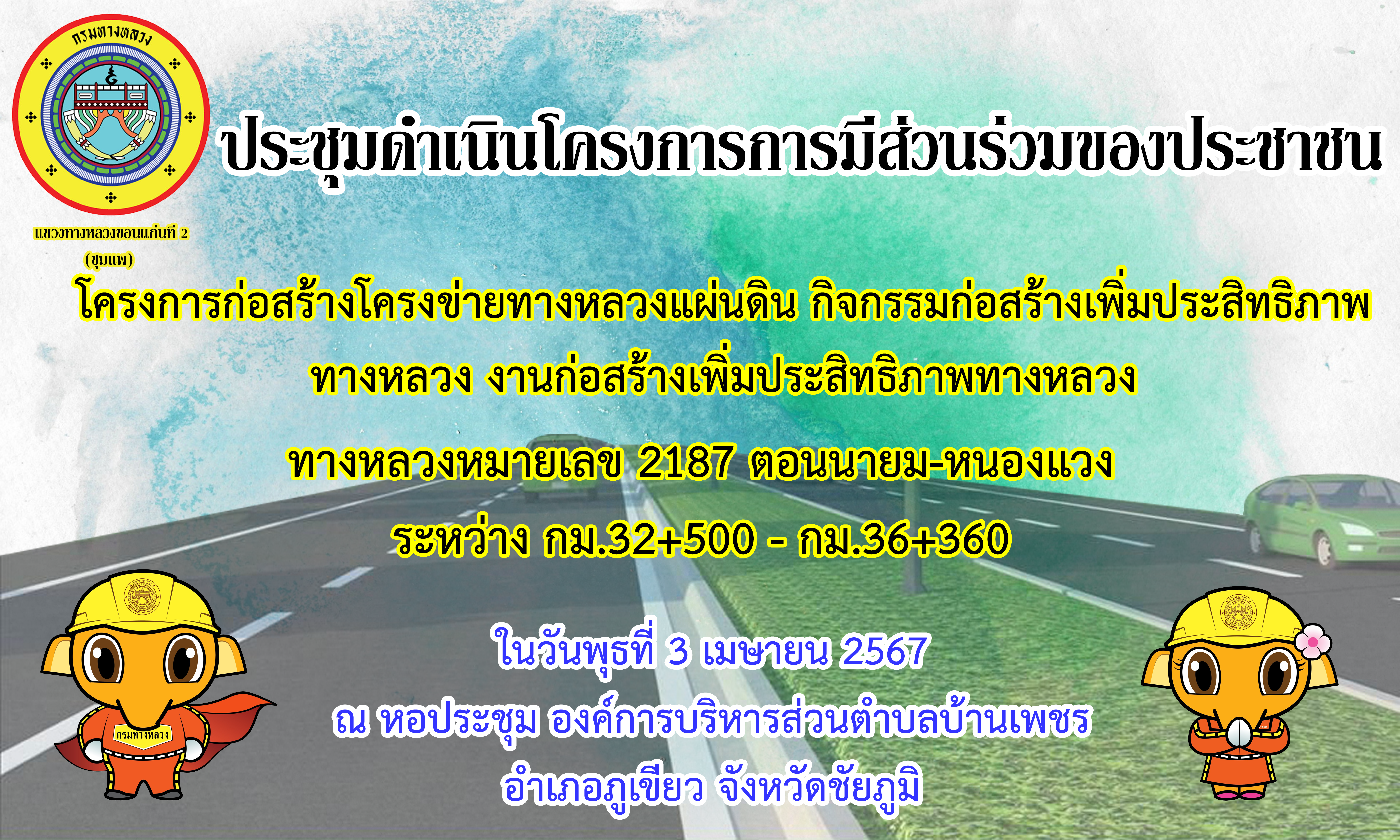 โครงการก่อสร้างโครงข่ายทางหลวงแผ่นดิน กิจกรรมก่อสร้างเพิ่มประสิทธิภาพทางหลวง งานก่อสร้างเพิ่มประสิทธิภาพทางหลวง ทางหลวงหมายเลข 2187 ตอน นายม – หนองแวง กม.32+000 - กม.36+360 |