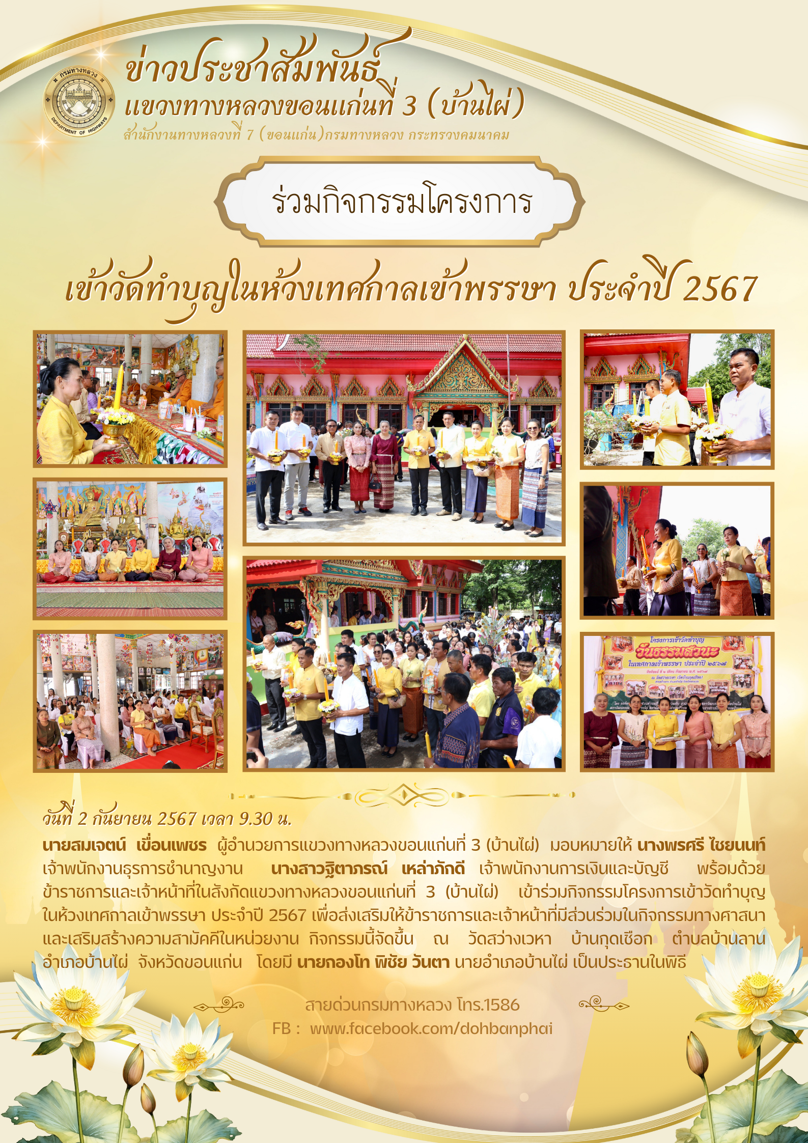 นายสมเจตน์ เขื่อนเพชร ผู้อำนวยการแขวงทางหลวงขอนแก่นที่ 3 (บ้านไผ่) มอบหมายให้ นางพรศรี ไชยนนท์ เจ้าพนักงานธุรการชำนาญงาน นางสาวฐิตาภรณ์ เหล่าภักดี เจ้าพนักงานการเงินและบัญชี พร้อมด้วยข้าราชการและเจ้าหน้าที่ในสังกัดแขวงทางหลวงขอนแก่นที่ 3 (บ้านไผ่) เข้าร่วมกิจกรรมโครงการเข้าวัดทำบุญ ในห้วงเทศกาลเข้าพรรษา ประจำปี 2567 เพื่อส่งเสริมให้ข้าราชการและเจ้าหน้าที่มีส่วนร่วมในกิจกรรมทางศาสนาและเสริมสร้างความสามัคคีในหน่วยงาน กิจกรรมนี้จัดขึ้น ณ วัดสว่างเวหา บ้านกุดเชือก ตำบลบ้านลาน อำเภอบ้านไผ่ จังหวัดขอนแก่น โดยมี นายกองโท พิชัย วันตา นายอำเภอบ้านไผ่ เป็นประธานในพิธี