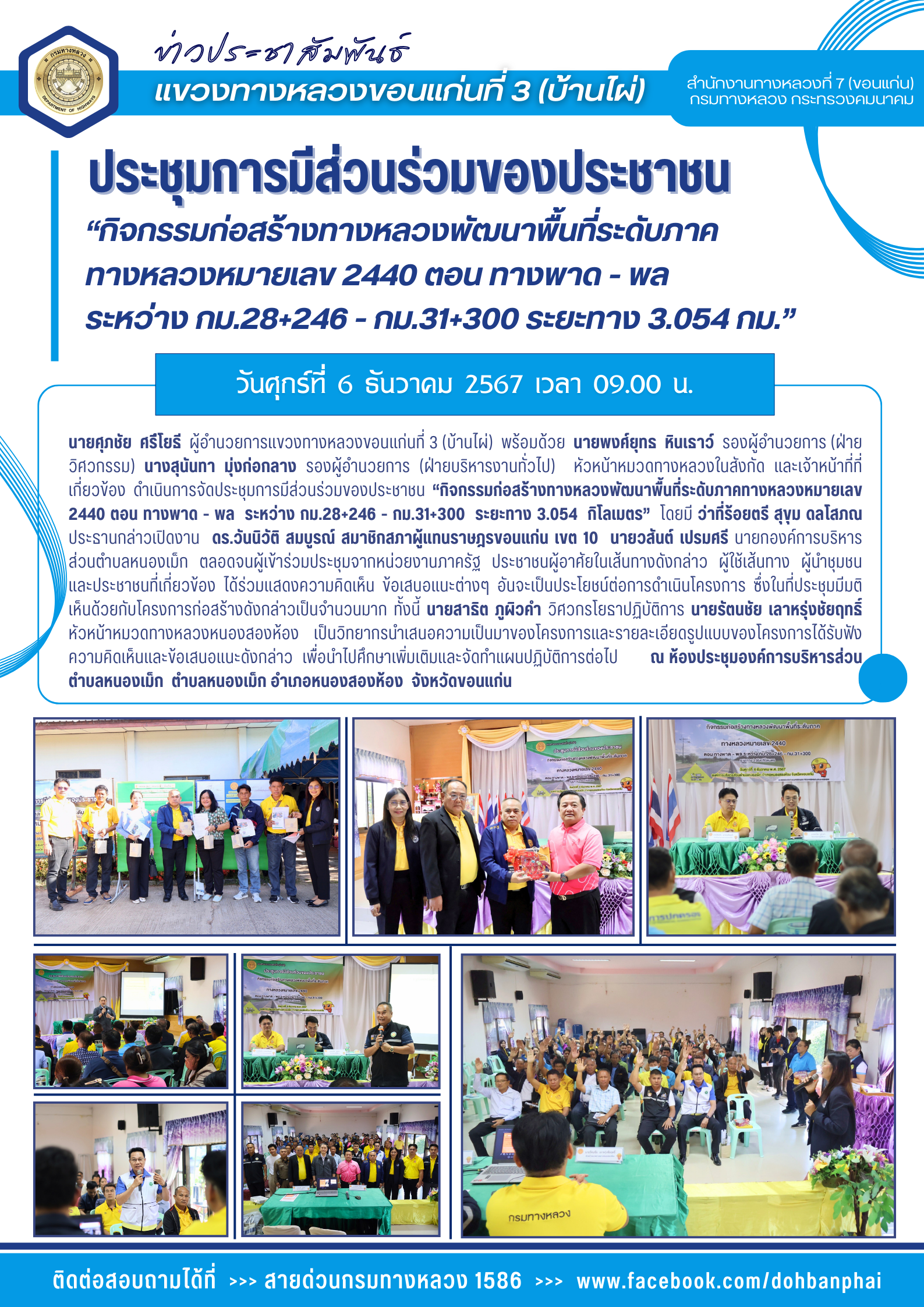 #ประชุมการมีส่วนร่วมของประชาชน “กิจกรรมก่อสร้างทางหลวงพัฒนาพื้นที่ระดับภาคทางหลวงหมายเลข 2440 ตอน ทางพาด - พล ระหว่าง กม.28+246 - กม.31+300 ระยะทาง 3.054 กิโลเมตร”