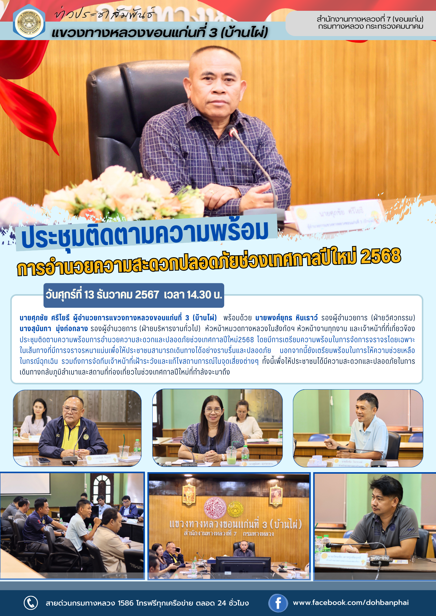 #นายศุภชัย ศรีโยธี ผู้อำนวยการแขวงทางหลวงขอนแก่นที่ 3 (บ้านไผ่)  พร้อมด้วย นายพงศ์ยุทธ หินเธาว์ รองผู้อำนวยการ (ฝ่ายวิศวกรรม)  นางสุนันทา  มุ่งก่อกลาง รองผู้อำนวยการ (ฝ่ายบริหารงานทั่วไป)  หัวหน้าหมวดทางหลวงในสังกัดฯ หัวหน้างานทุกงาน และเจ้าหน้าที่ที่เกี่ยวข้อง ประชุมติดตามความพร้อมการอำนวยความสะดวกและปลอดภัยช่วงเทศกาลปีใหม่2568 โดยมีการเตรียมความพร้อมในการจัดการจราจรโดยเฉพาะในเส้นทางที่มีการจราจรหนาแน่นเพื่อให้ประชาชนสามารถเดินทางได้อย่างราบรื่นและปลอดภัย นอกจากนี้ยังเตรียมพร้อมในการให้ความช่วยเหลือในกรณีฉุกเฉิน รวมถึงการจัดทีมเจ้าหน้าที่เฝ้าระวังและแก้ไขสถานการณ์ในจุดเสี่ยงต่างๆ ทั้งนี้เพื่อให้ประชาชนได้มีความสะดวกและปลอดภัยในการเดินทางกลับภูมิลำเนาและสถานที่ท่องเที่ยวในช่วงเทศกาลปีใหม่ที่กำลังจะมาถึง