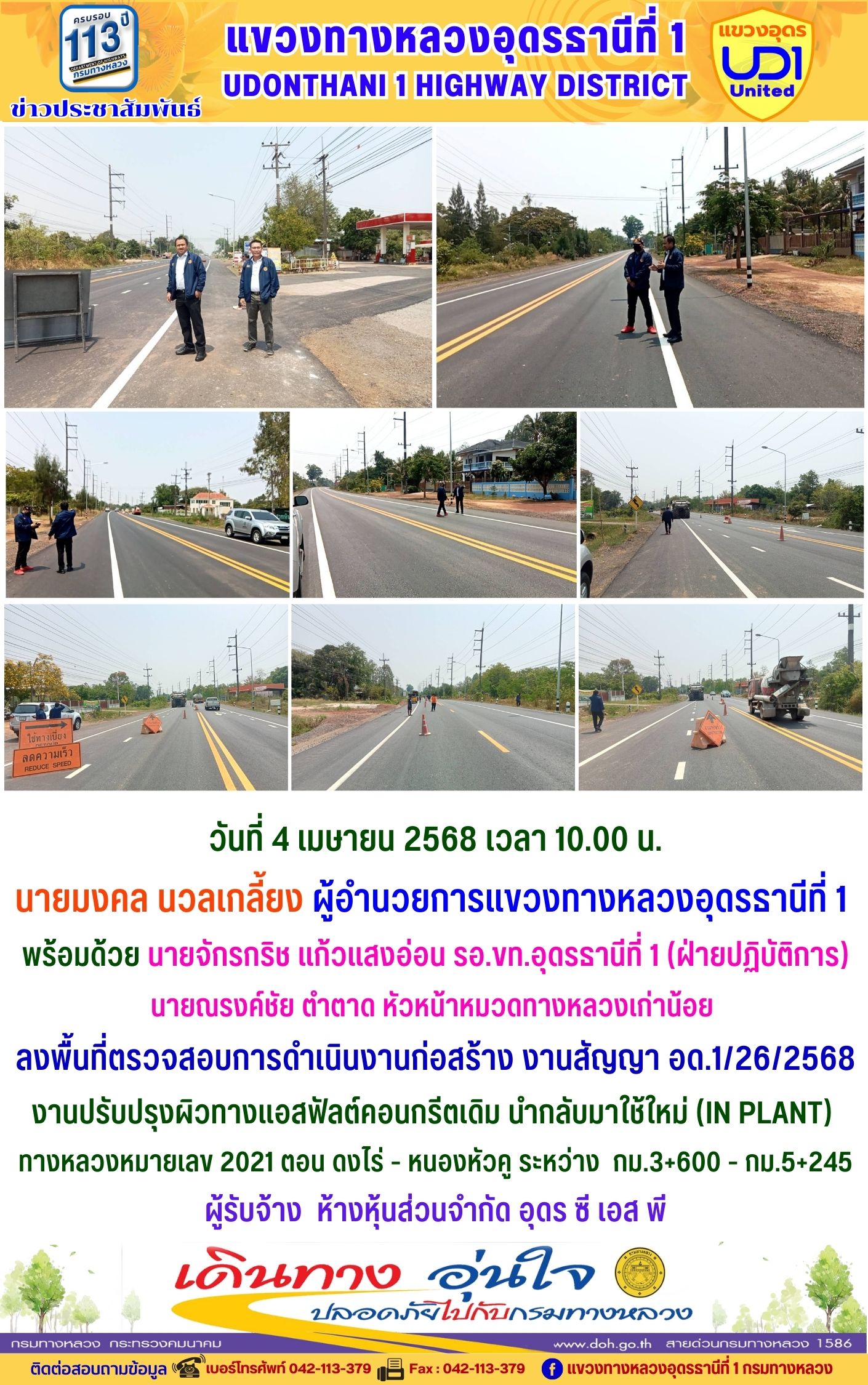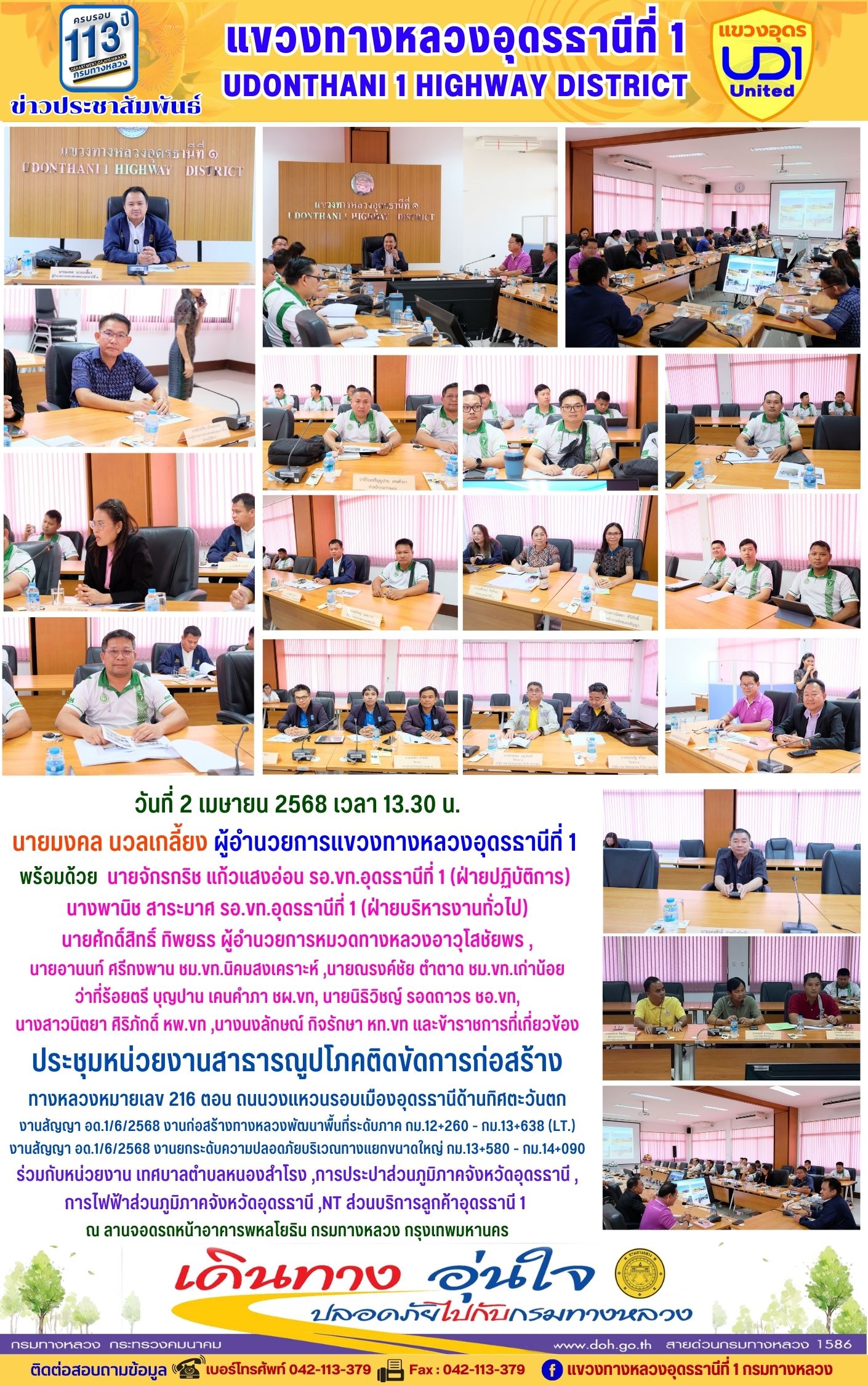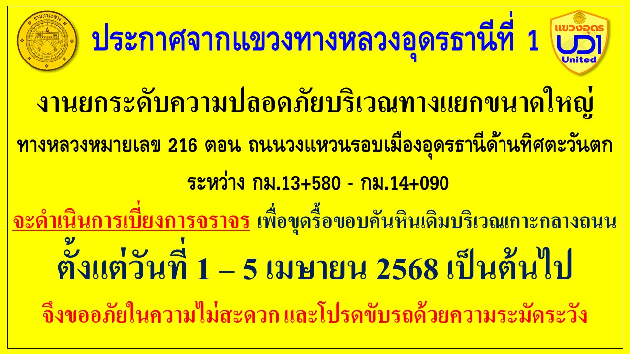 147 01/04/2568 การเบี่ยงการจราจร งานยกระดับความปลอดภัยบริเวณทางแยกขนาดใหญ่ ทางหลวงหมายเลข 216 ตอน ถนนวงแหวนรอบเมืองอุดรธานีด้านทิศตะวันตก ระหว่าง กม.13+580 - กม.14+090