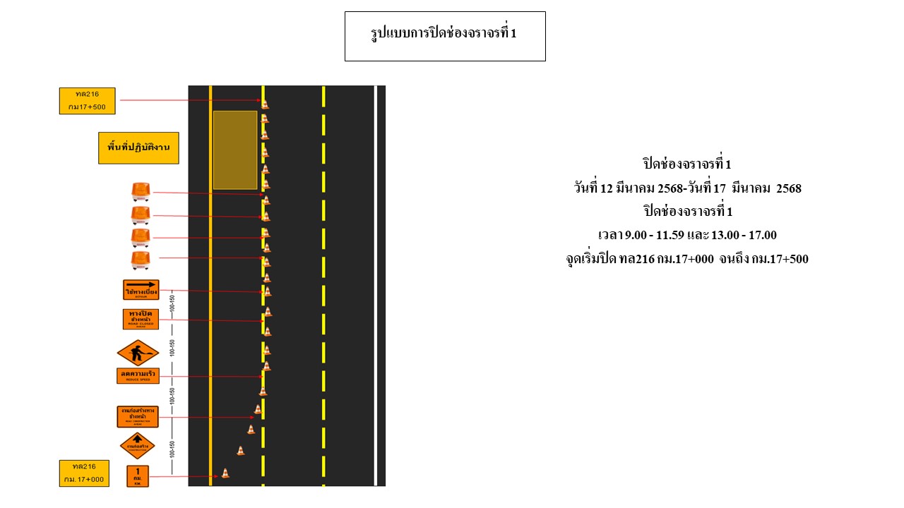 จะดำเนินการปิดช่องจราจร 2 ช่อง เพื่อทำการติดตั้งอุปกรณ์บนพื้นผิวถนน ทางหลวงหมายเลข 216 ตอน ถนนวงแหวนรอบเมืองอุดรธานีด้านทิศตะวันออก กม.17+000 - กม.17+500