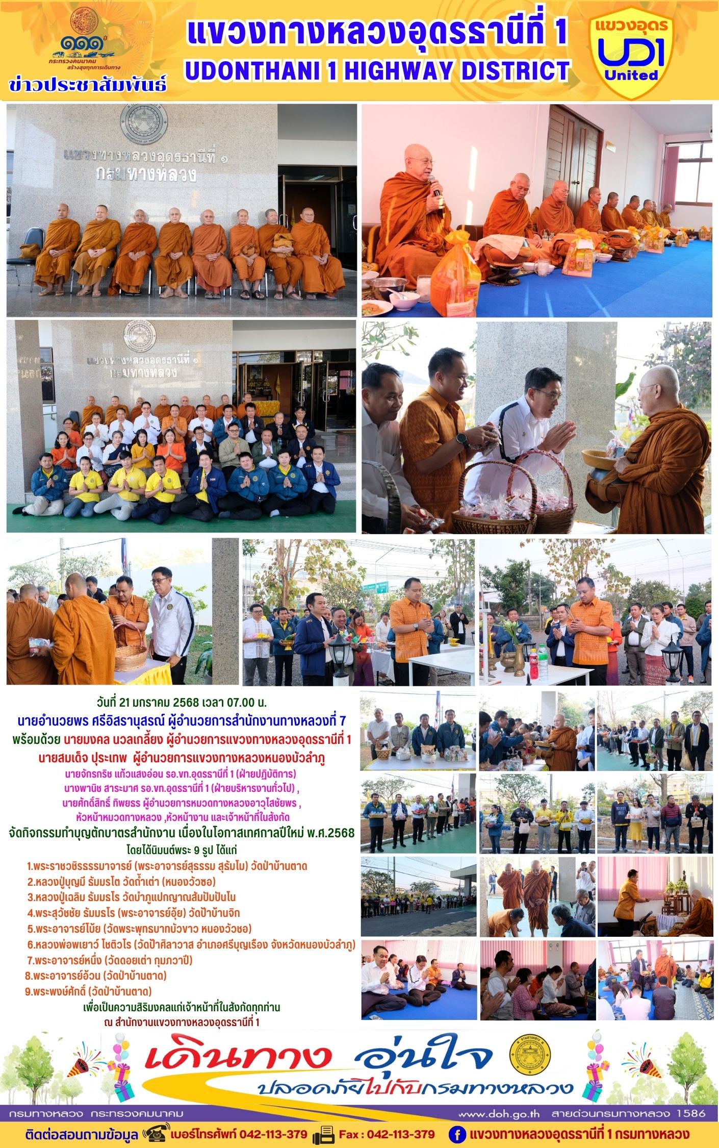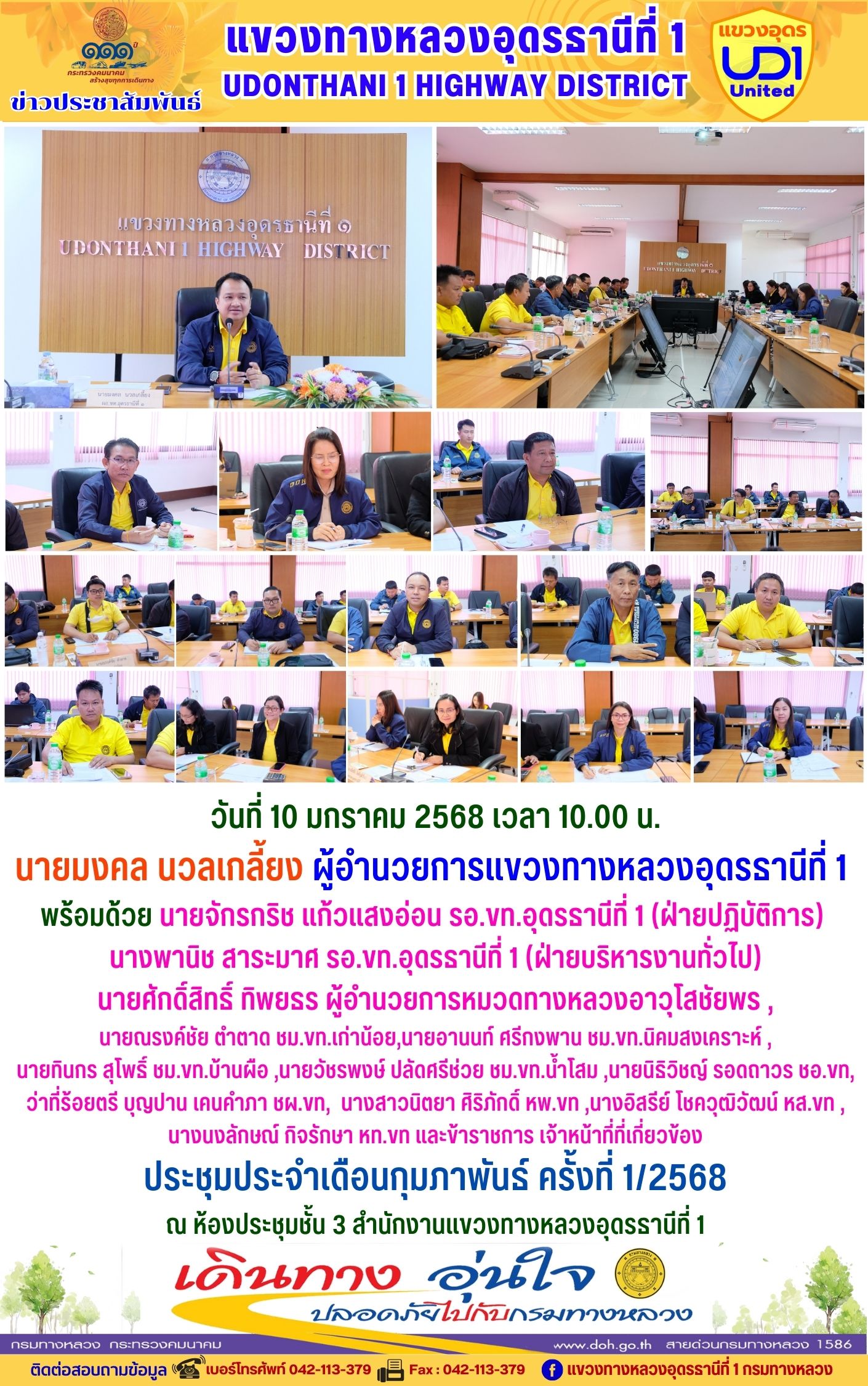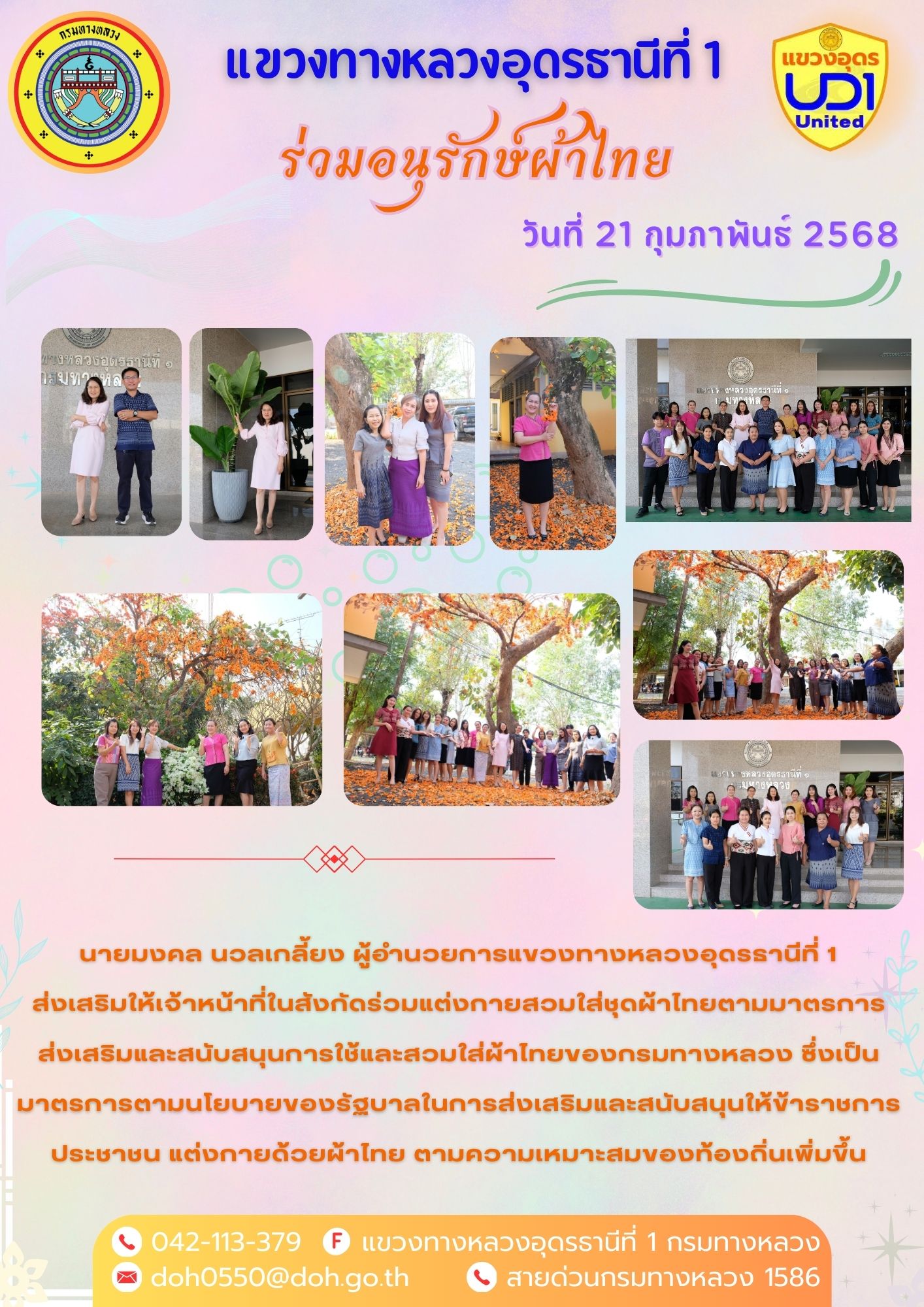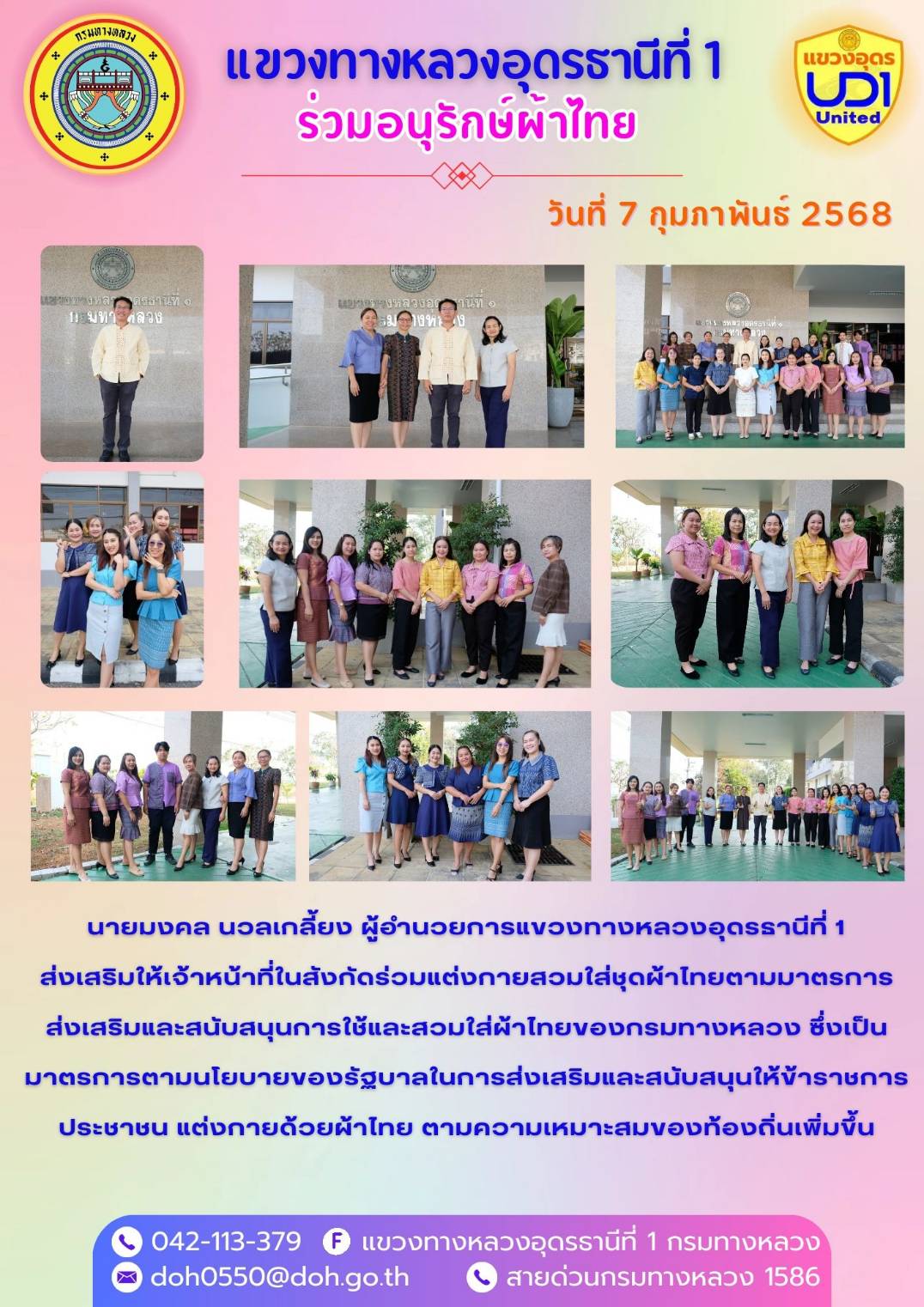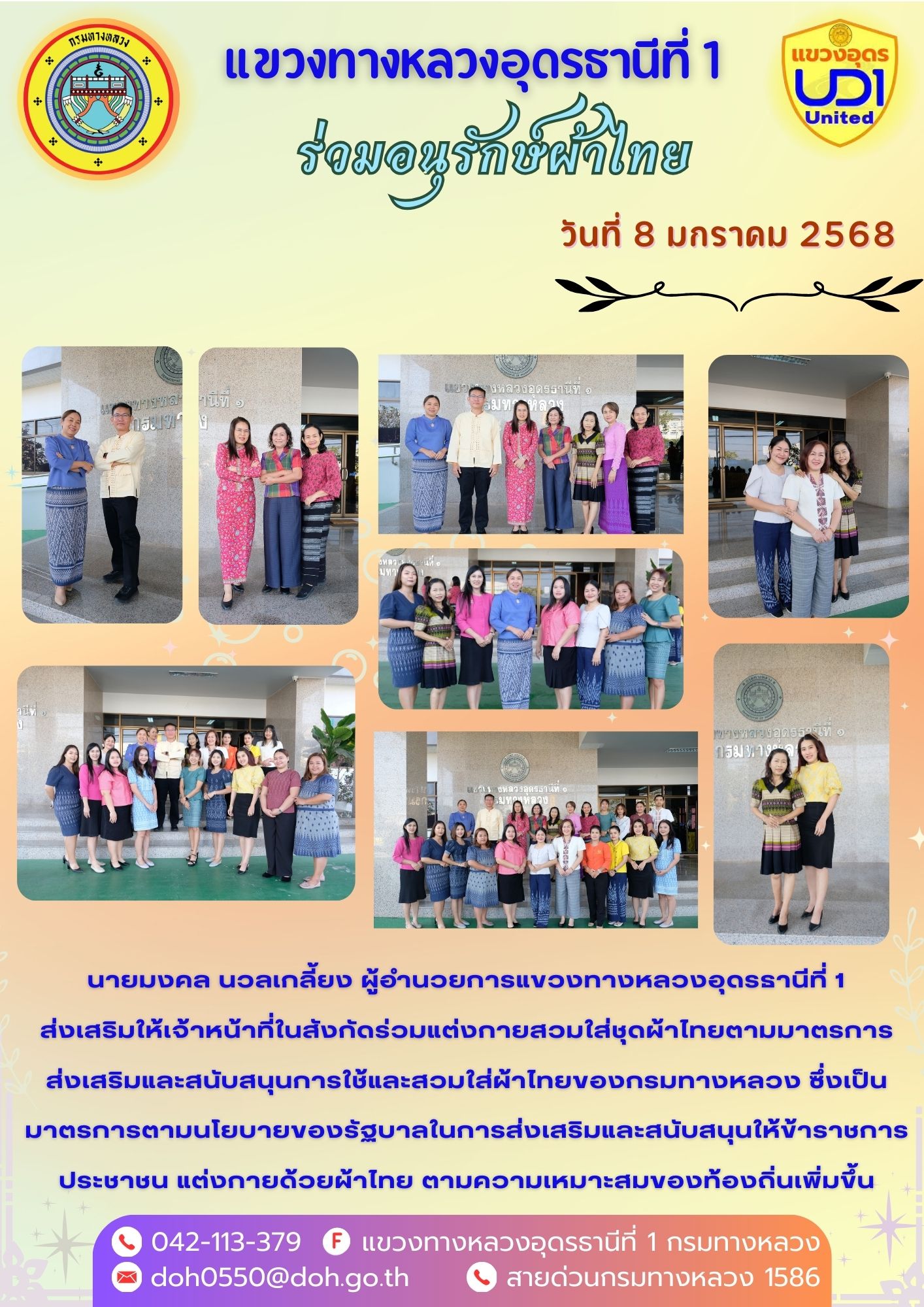 202 31/01/2568 นายมงคล นวลเกลี้ยง ผู้อำนวยการแขวงทางหลวงอุดรธานีที่ 1 ส่งเสริมให้เจ้าหน้าที่ในสังกัดร่วมแต่งกายสวมใส่ชุดผ้าไทยตามมาตรการ ส่งเสริมและสนับสนุนการใช้และสวมใส่ผ้าไทยของกรมทางหลวง ซึ่งเป็นมาตรการตามนโยบายของรัฐบาลในการส่งเสริมและสนับสนุนให้ข้าราชการ ประชาชน แต่งกายด้วยผ้าไทย ตามความเหมาะสมของท้องถิ่นเพิ่มขึ้น