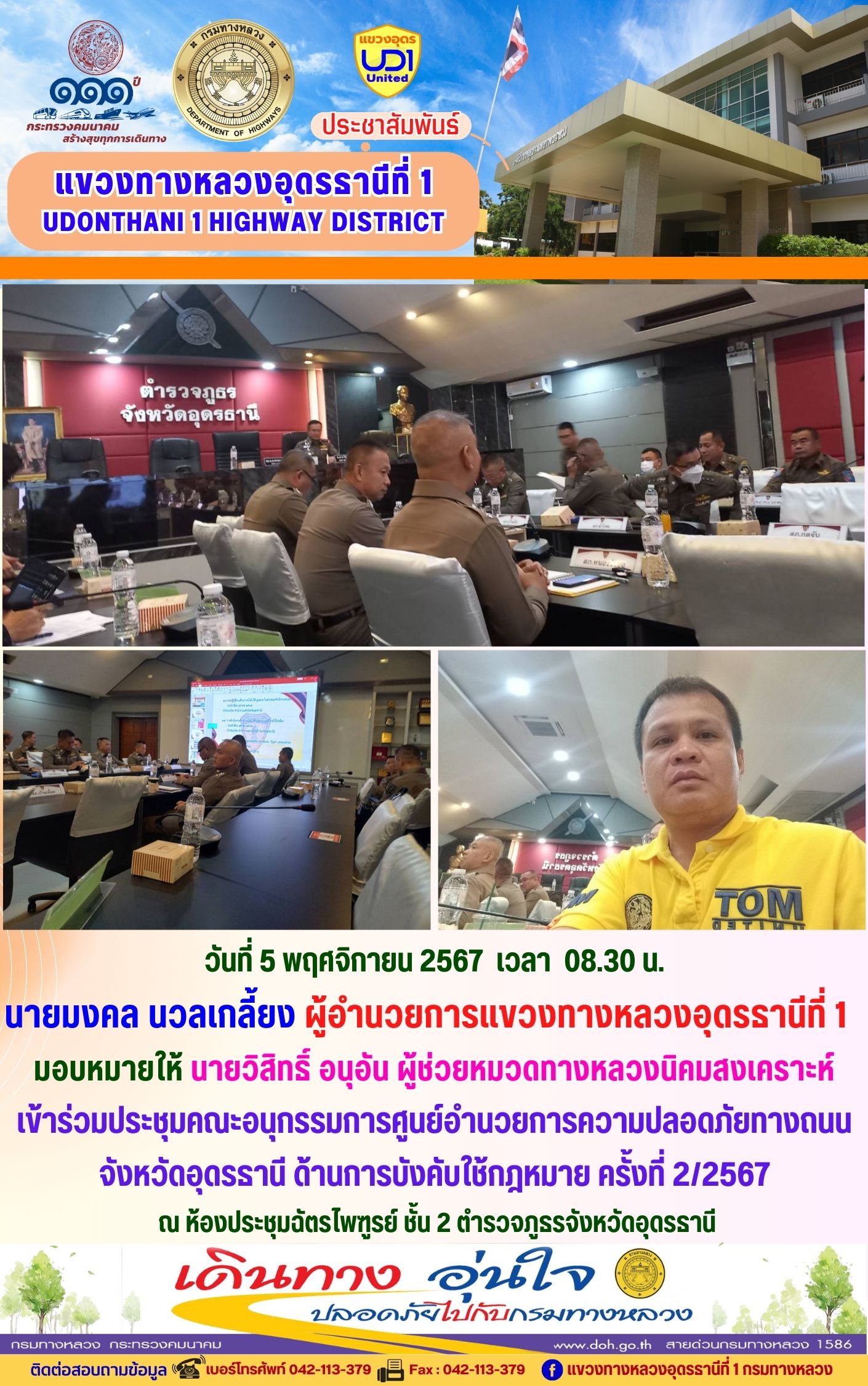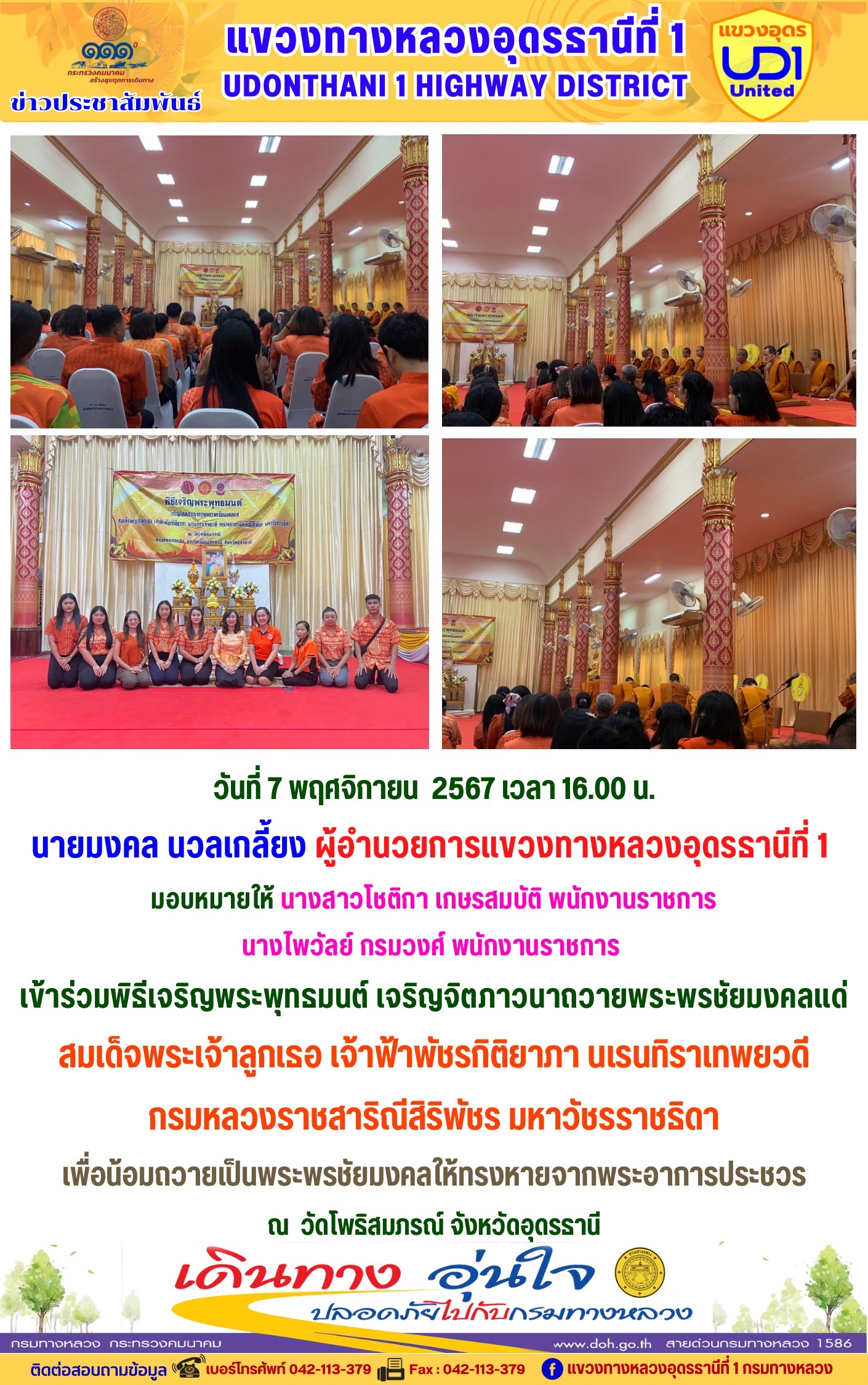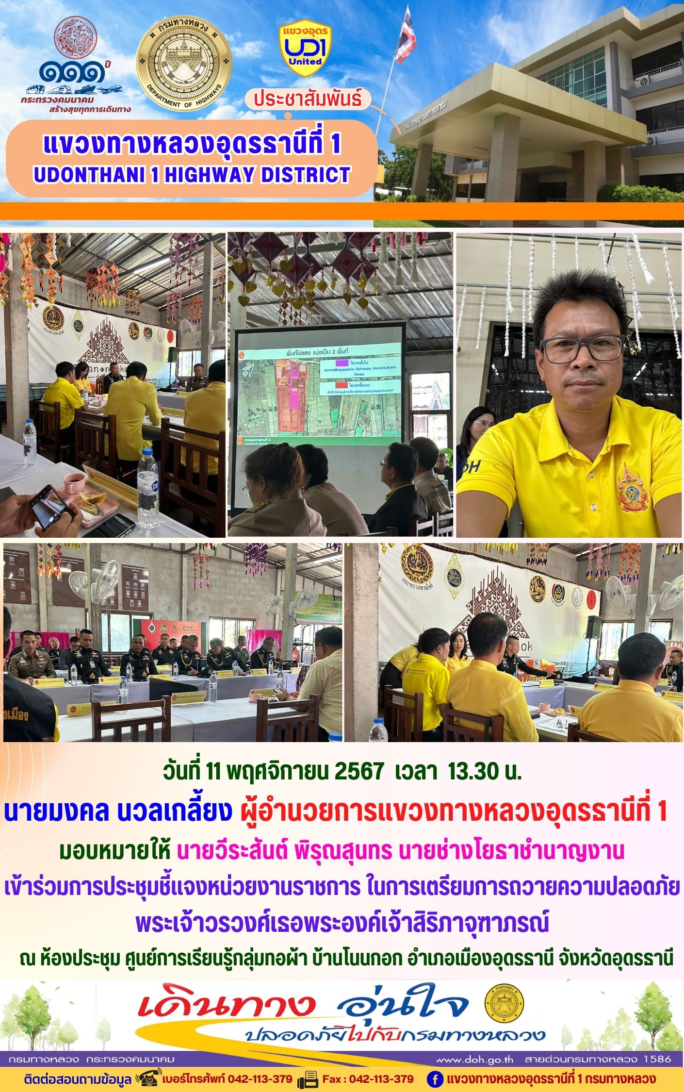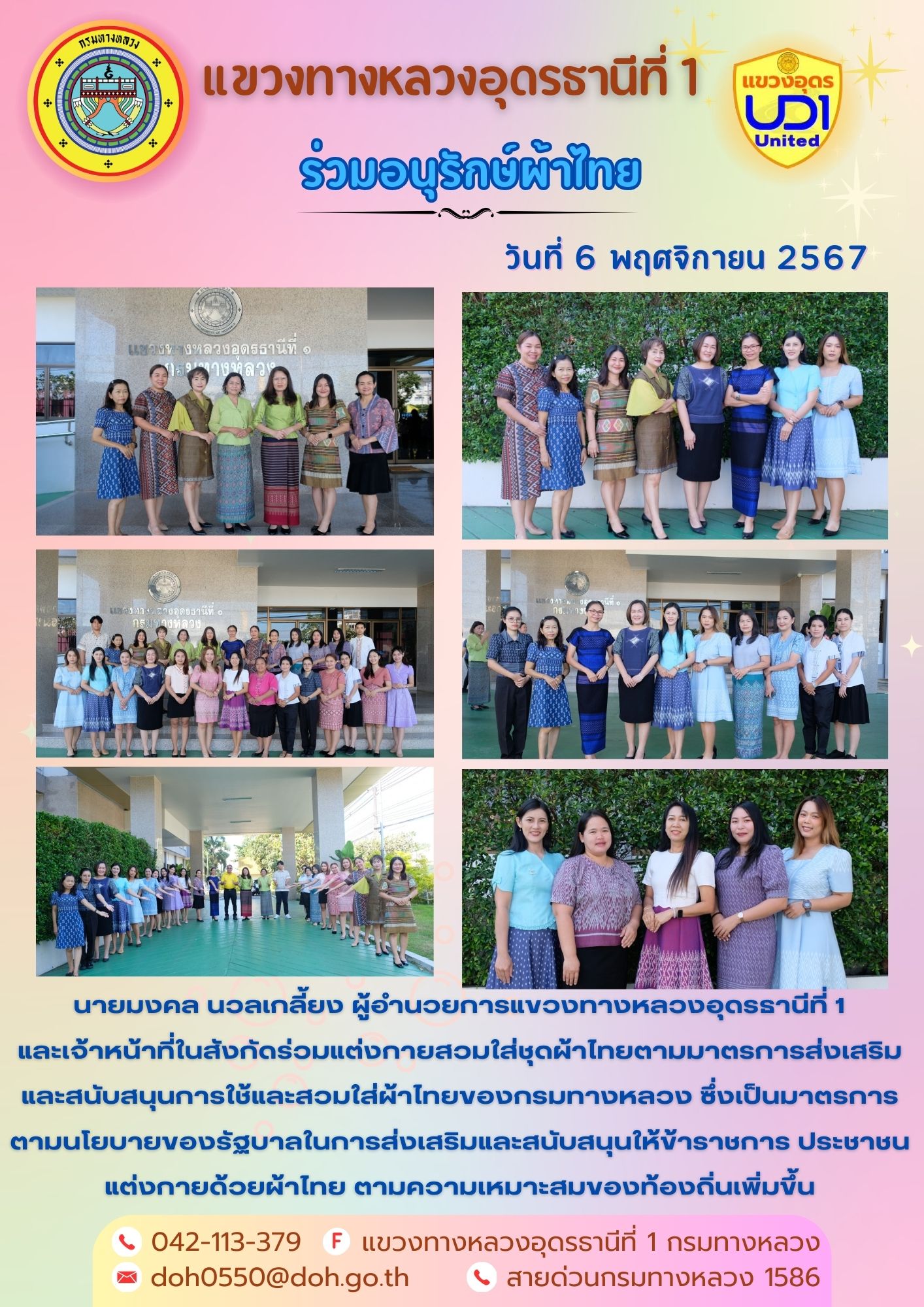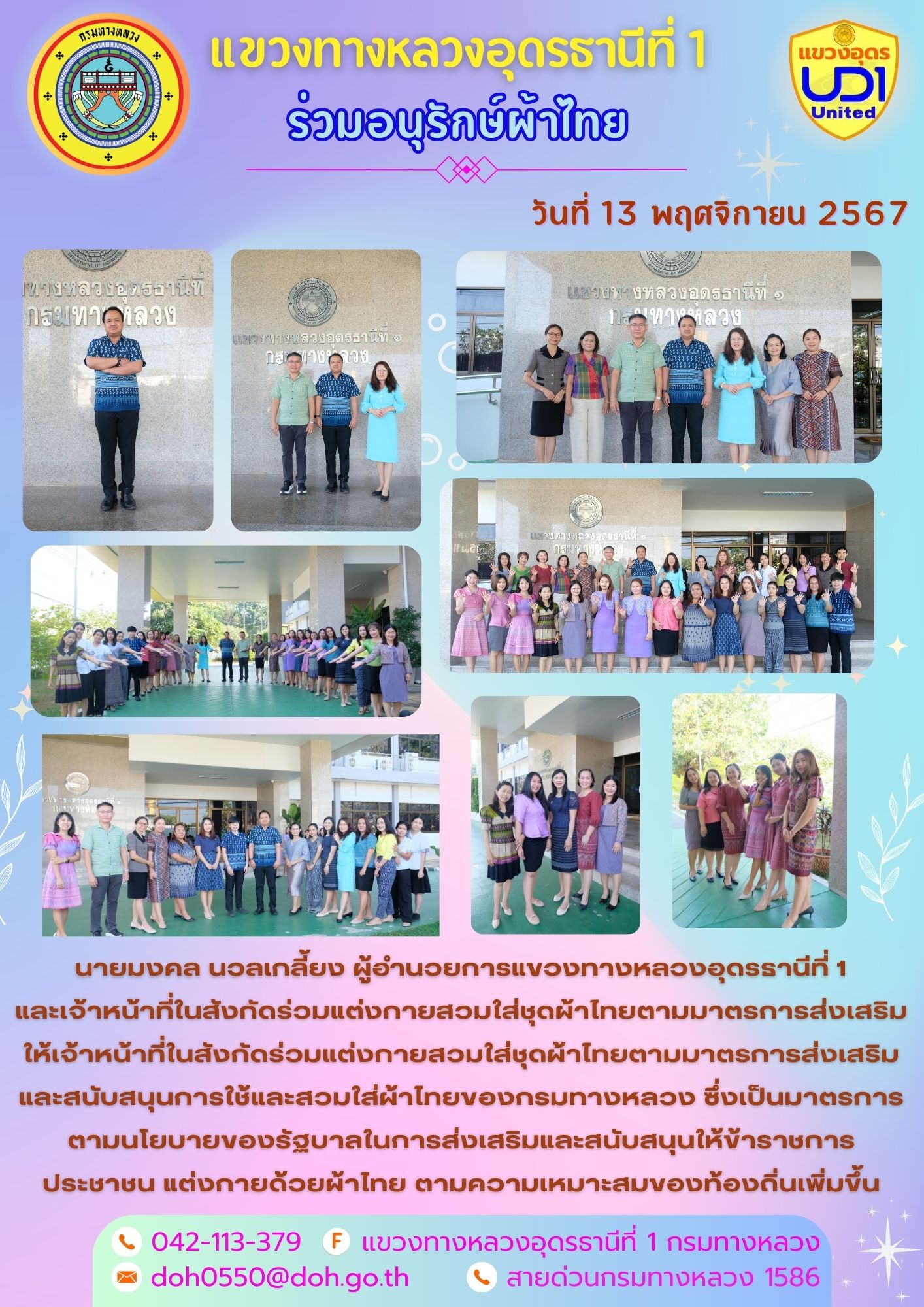 นายมงคล นวลเกลี้ยง ผู้อำนวยการแขวงทางหลวงอุดรธานีที่ 1 และเจ้าหน้าที่ในสังกัดร่วมแต่งกายสวมใส่ชุดผ้าไทยตามมาตรการส่งเสริมให้เจ้าหน้าที่ในสังกัดร่วมแต่งกายสวมใส่ชุดผ้าไทยตามมาตรการส่งเสริมและสนับสนุนการใช้และสวมใส่ผ้าไทยของกรมทางหลวง ซึ่งเป็นมาตรการตามนโยบายของรัฐบาลในการส่งเสริมและสนับสนุนให้ข้าราชการ ประชาชน แต่งกายด้วยผ้าไทย ตามความเหมาะสมของท้องถิ่นเพิ่มขึ้น