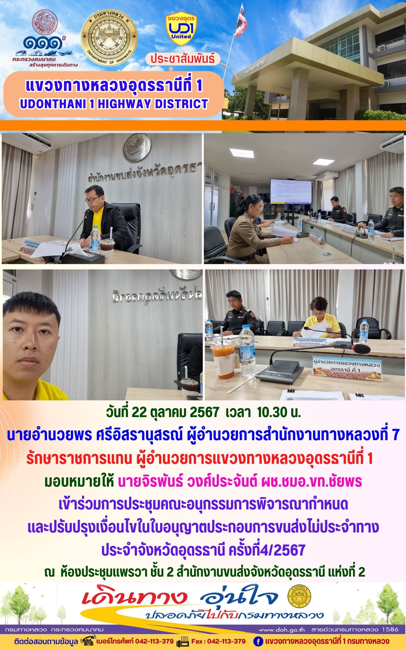 เข้าร่วมการประชุมคณะอนุกรรมการพิจารณากำหนด และปรับปรุงเงื่อนไขในใบอนุญาตประกอบการขนส่งไม่ประจำทาง ประจำจังหวัดอุดรธานี ครั้งที่4/2567