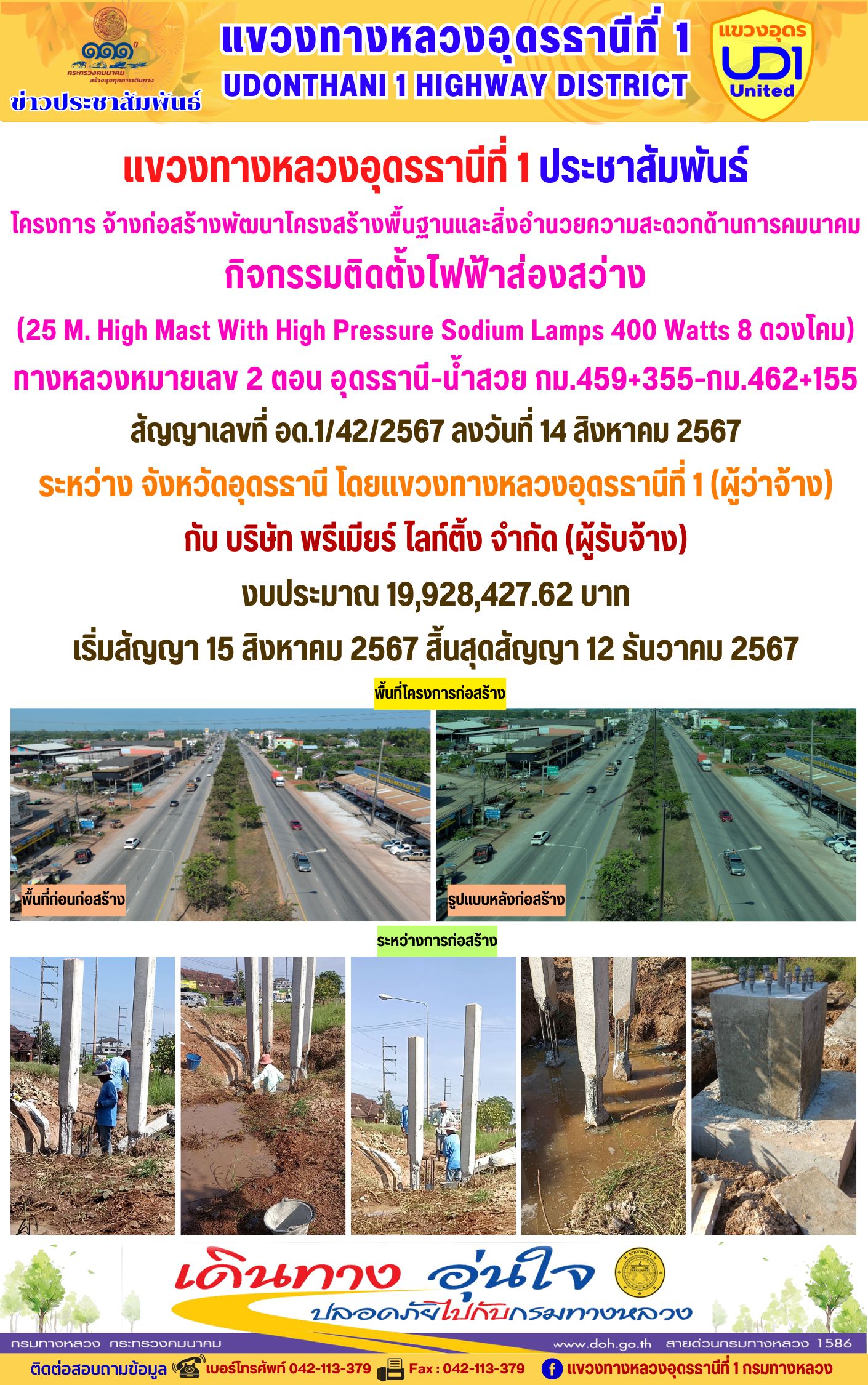 แขวงทางหลวงอุดรธานีที่ 1 ประชาสัมพันธ์ โครงการ จ้างก่อสร้างพัฒนาโครงสร้างพื้นฐานและสิ่งอำนวยความสะดวกด้านการคมนาคม กิจกรรมติดตั้งไฟฟ้าส่องสว่าง (25 M. High Mast With High Pressure Sodium Lamps 400 Watts 8 ดวงโคม) ทางหลวงหมายเลข 2 ตอน อุดรธานี-น้ำสวย กม.459+355-กม.462+155 สัญญาเลขที่ อด.1/42/2567
