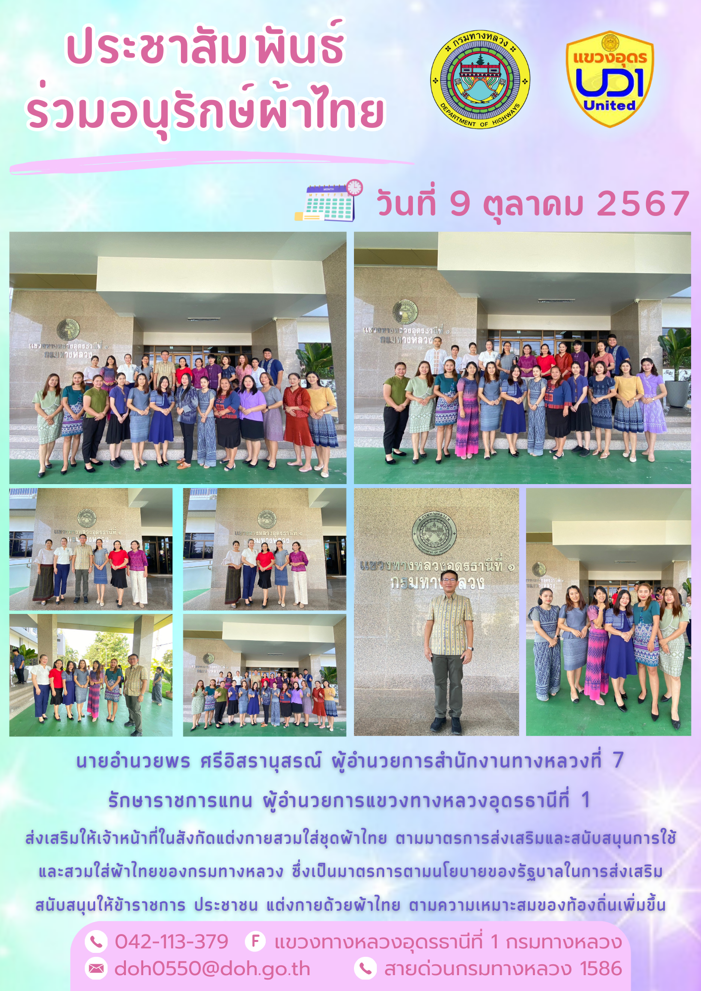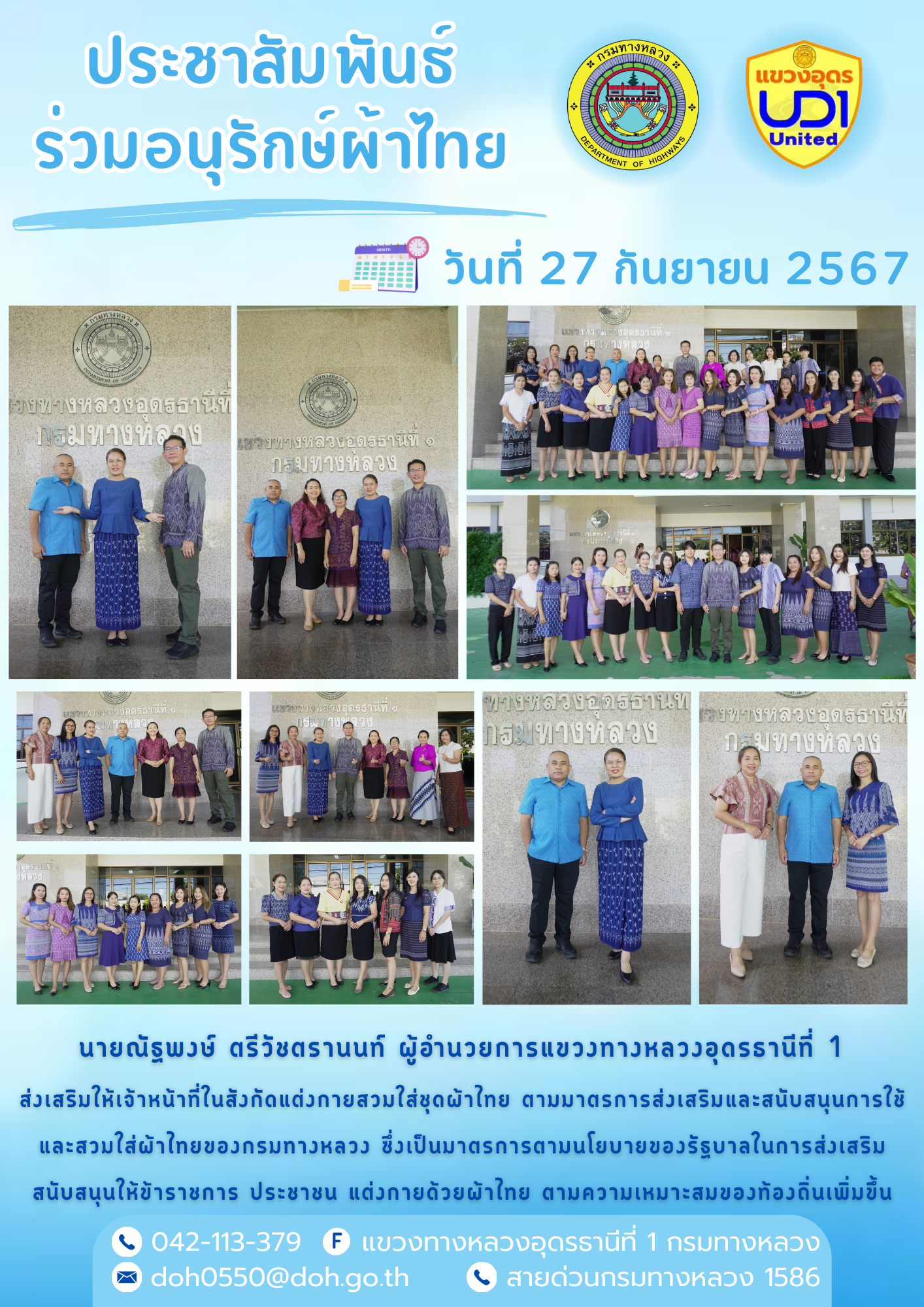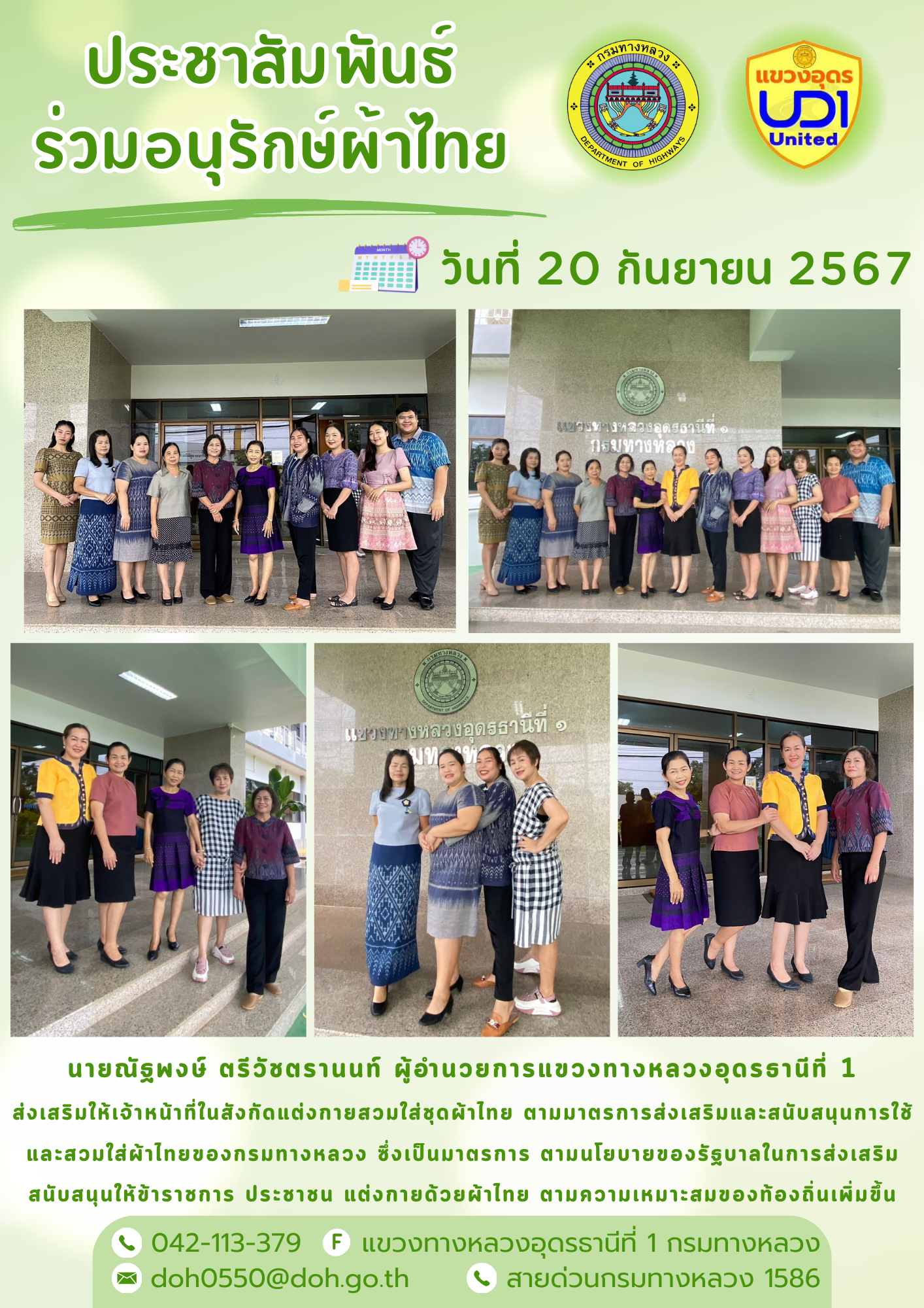 นายณัฐพงษ์ ตรีวัชตรานนท์ ผู้อำนวยการแขวงทางหลวงอุดรธานีที่ 1 พร้อมด้วย นายจักรกริช แก้วแสงอ่อน รองผู้อำนวยการ (ฝ่ายปฏิบัติการ) นางพานิช สาระมาศ รองผู้อำนวยการ (ฝ่ายบริหารงานทั่วไป) และเจ้าหน้าที่ในสังกัดร่วมแต่งกายสวมใส่ชุดผ้าไทยตามมาตรการส่งเสริมและสนับสนุนการใช้ และสวมใส่ผ้าไทยของกรมทางหลวง ซึ่งเป็นมาตรการตามนโยบายของรัฐบาลในการส่งเสริม และสนับสนุนให้ข้าราชการ ประชาชน แต่งกายด้วยผ้าไทย ตามความเหมาะสมของท้องถิ่นเพิ่มขึ้น