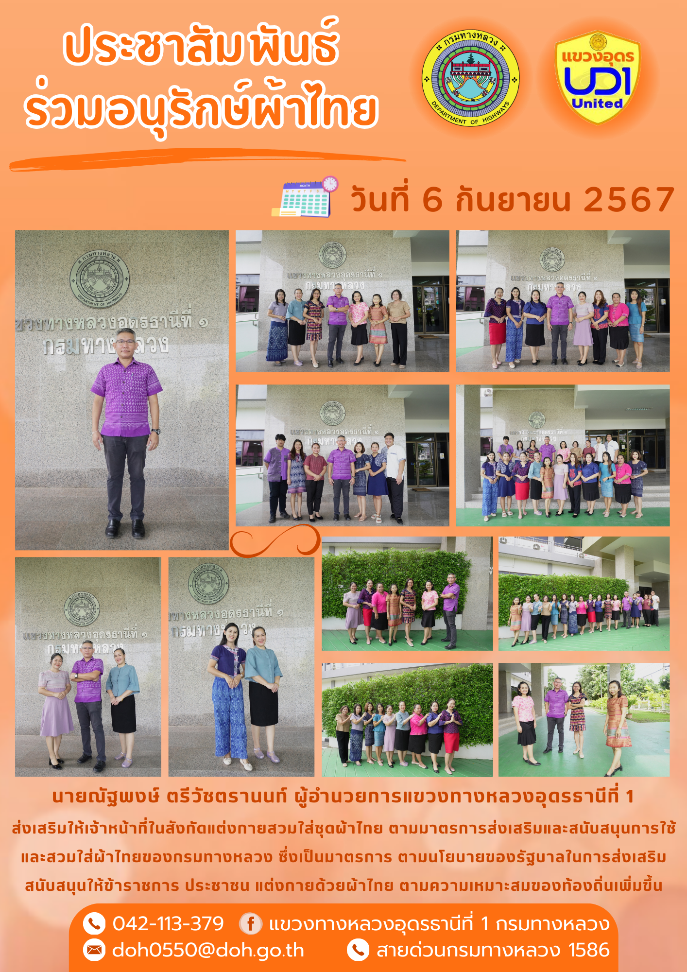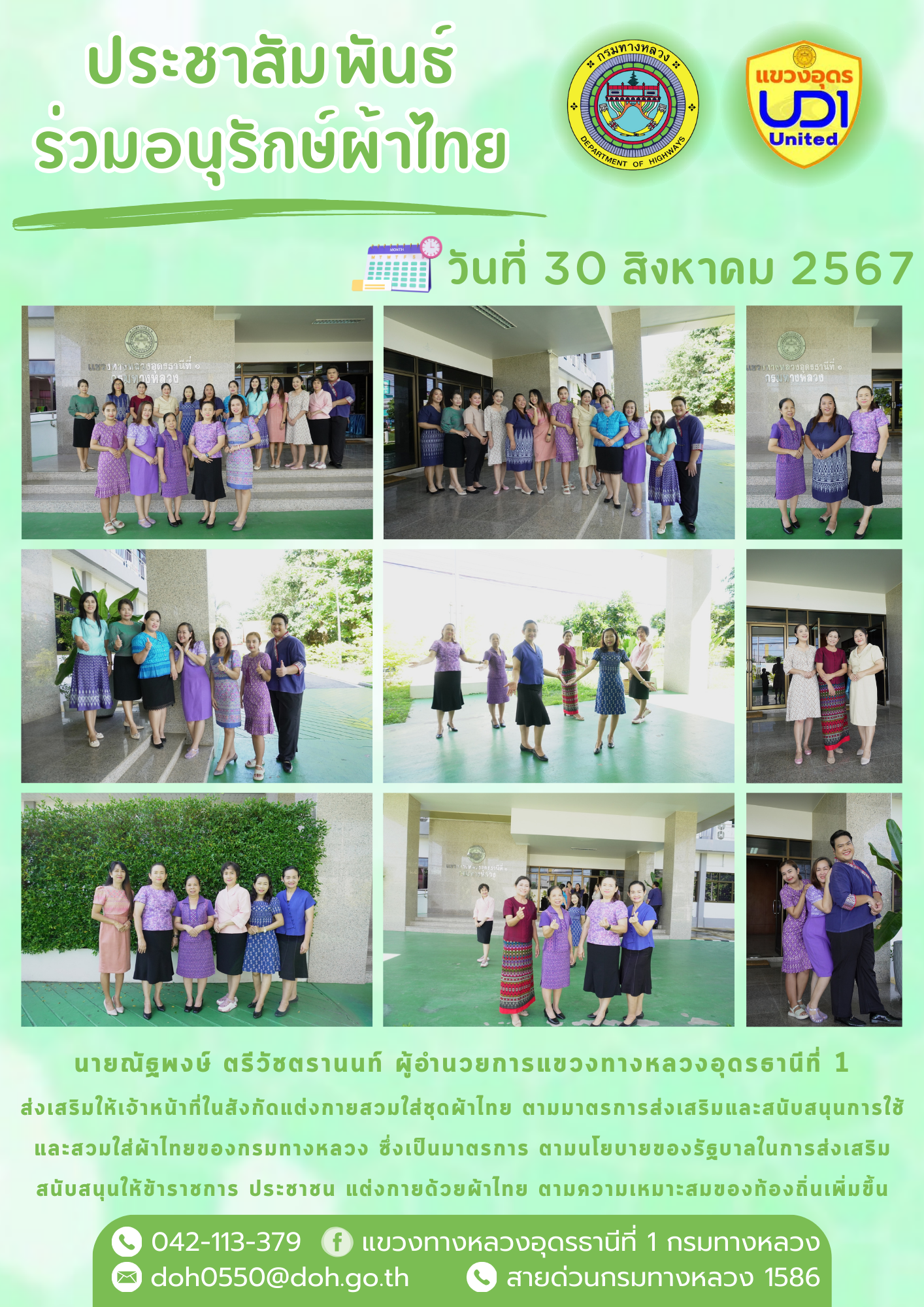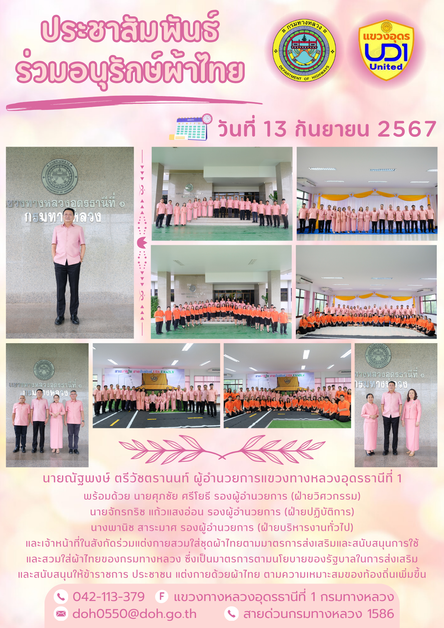 นายณัฐพงษ์ ตรีวัชตรานนท์ ผู้อำนวยการแขวงทางหลวงอุดรธานีที่ 1 พร้อมด้วย นายจักรกริช แก้วแสงอ่อน รองผู้อำนวยการ (ฝ่ายปฏิบัติการ) นางพานิช สาระมาศ รองผู้อำนวยการ (ฝ่ายบริหารงานทั่วไป) และเจ้าหน้าที่ในสังกัดร่วมแต่งกายสวมใส่ชุดผ้าไทยตามมาตรการส่งเสริมและสนับสนุนการใช้ และสวมใส่ผ้าไทยของกรมทางหลวง ซึ่งเป็นมาตรการตามนโยบายของรัฐบาลในการส่งเสริม และสนับสนุนให้ข้าราชการ ประชาชน แต่งกายด้วยผ้าไทย ตามความเหมาะสมของท้องถิ่นเพิ่มขึ้น