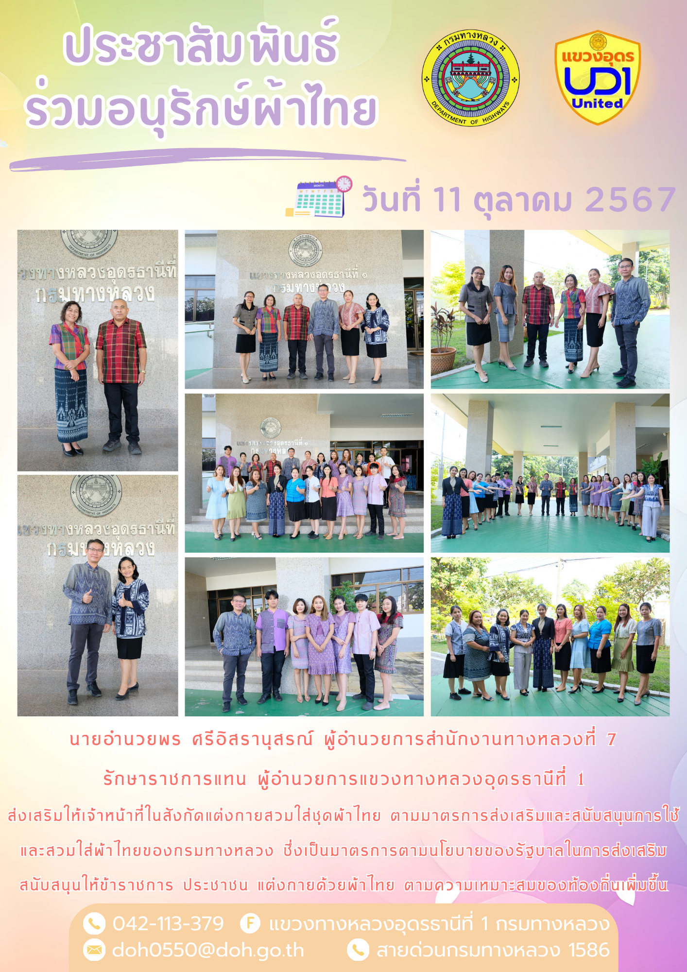 นายอำนวยพร ศรีอิสรานุสรณ์ ผู้อำนวยการสำนักงานทางหลวงที่ 7 รักษาราชการแทน ผู้อำนวยการแขวงทางหลวงอุดรธานีที่ 1 ส่งเสริมให้เจ้าหน้าที่ในสังกัดแต่งกายสวมใส่ชุดผ้าไทย ตามมาตรการส่งเสริมและสนับสนุนการใช้ และสวมใส่ผ้าไทยของกรมทางหลวง ซึ่งเป็นมาตรการตามนโยบายของรัฐบาลในการส่งเสริม สนับสนุนให้ข้าราชการ ประชาชน แต่งกายด้วยผ้าไทย ตามความเหมาะสมของท้องถิ่นเพิ่มขึ้น