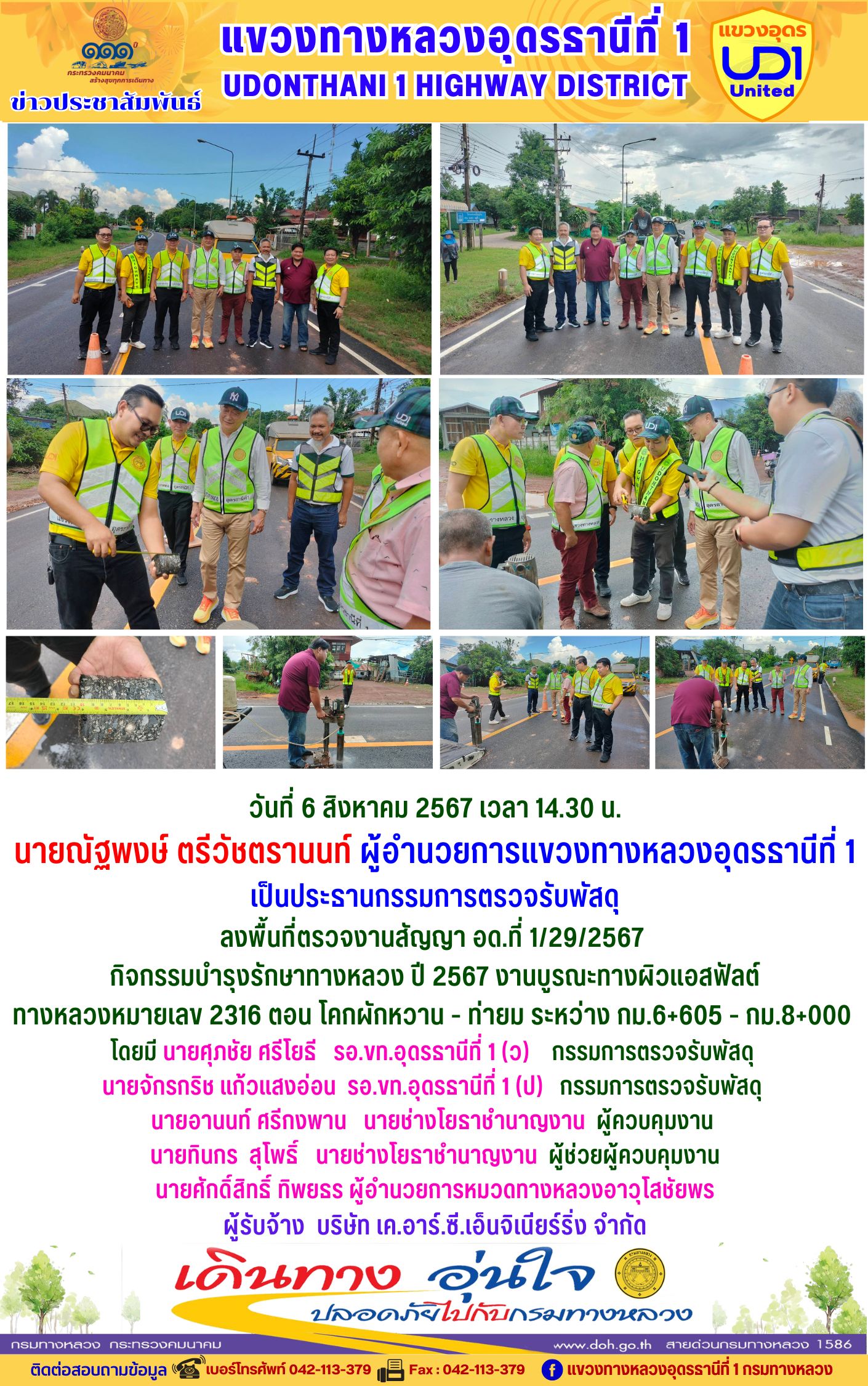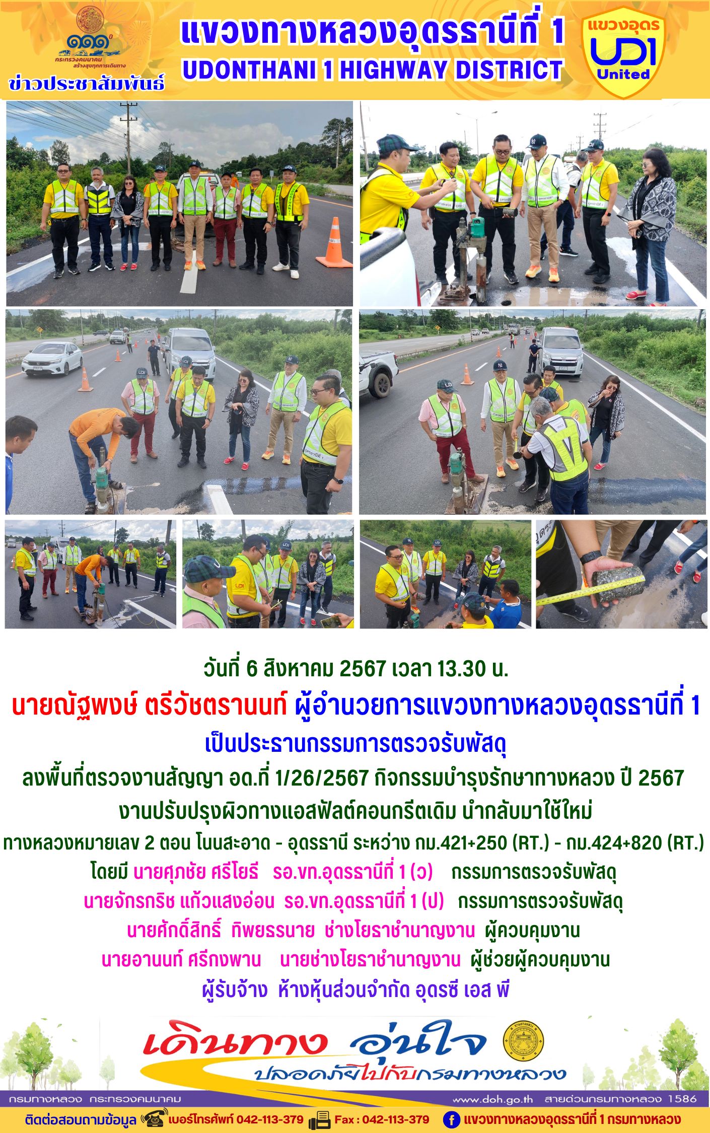 ลงพื้นที่ตรวจงานสัญญา อด.ที่ 1/26/2567 กิจกรรมบำรุงรักษาทางหลวง ปี 2567 งานปรับปรุงผิวทางแอสฟัลต์คอนกรีตเดิม นำกลับมาใช้ใหม่ ทางหลวงหมายเลข 2 ตอน โนนสะอาด - อุดรธานี ระหว่าง กม.421+250 (RT.) - กม.424+820 (RT.)