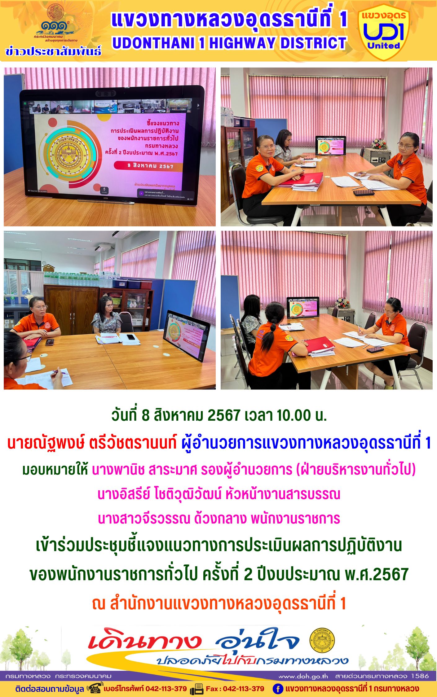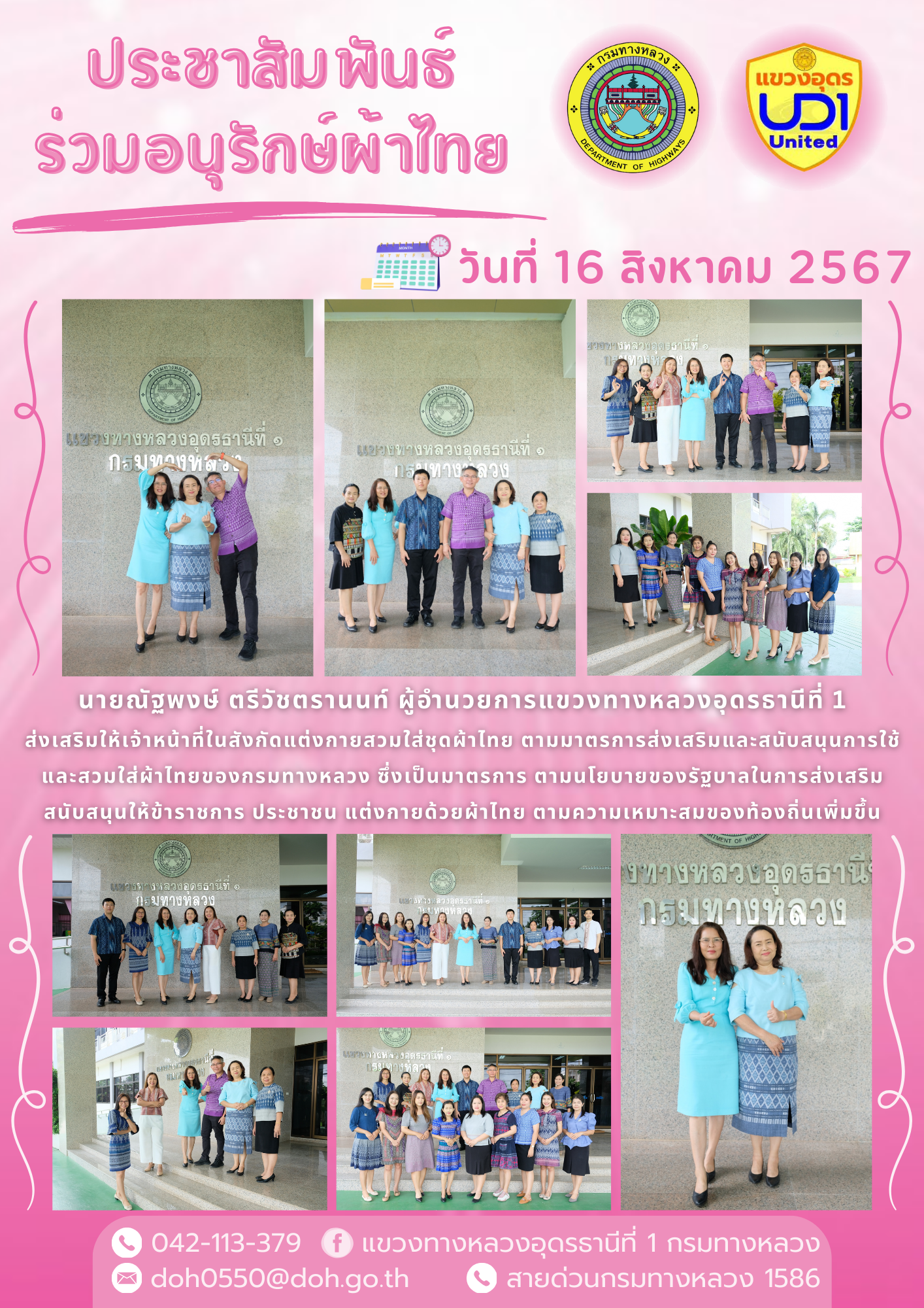 นายณัฐพงษ์ ตรีวัชตรานนท์ ผู้อำนวยการแขวงทางหลวงอุดรธานีที่ 1 พร้อมด้วย นางพานิช สาระมาศ รองผู้อำนวยการ (ฝ่ายบริหารงานทั่วไป) และเจ้าหน้าที่ในสังกัดร่วมแต่งกายสวมใส่ชุดผ้าไทยตามมาตรการส่งเสริมและสนับสนุนการใช้ และสวมใส่ผ้าไทยของกรมทางหลวง ซึ่งเป็นมาตรการตามนโยบายของรัฐบาลในการส่งเสริม และสนับสนุนให้ข้าราชการ ประชาชน แต่งกายด้วยผ้าไทย ตามความเหมาะสมของท้องถิ่นเพิ่มขึ้น