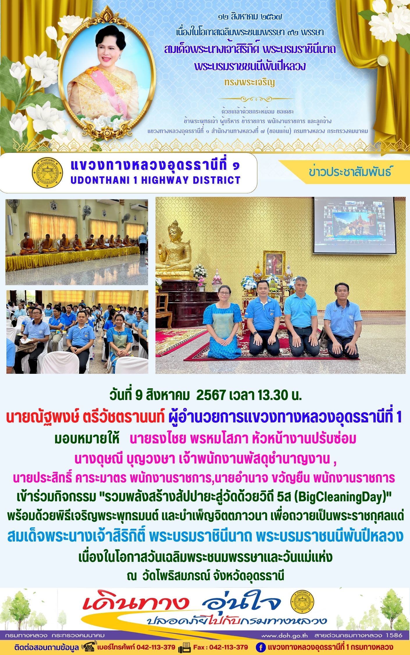 เข้าร่วมกิจกรรม "รวมพลังสร้างสัปปายะสู่วัดด้วยวิถี 5ส (BigCleaningDay)" พร้อมด้วยพิธีเจริญพระพุทธมนต์ และบําเพ็ญจิตตภาวนา เพื่อถวายเป็นพระราชกุศลแด่ สมเด็จพระนางเจ้าสิริกิติ์ พระบรมราชินีนาถ พระบรมราชนนีพันปีหลวง เนื่องในโอกาสวันเฉลิมพระชนมพรรษาและวันแม่แห่ง ณ วัดโพธิสมภรณ์ จังหวัดอุดรธานี