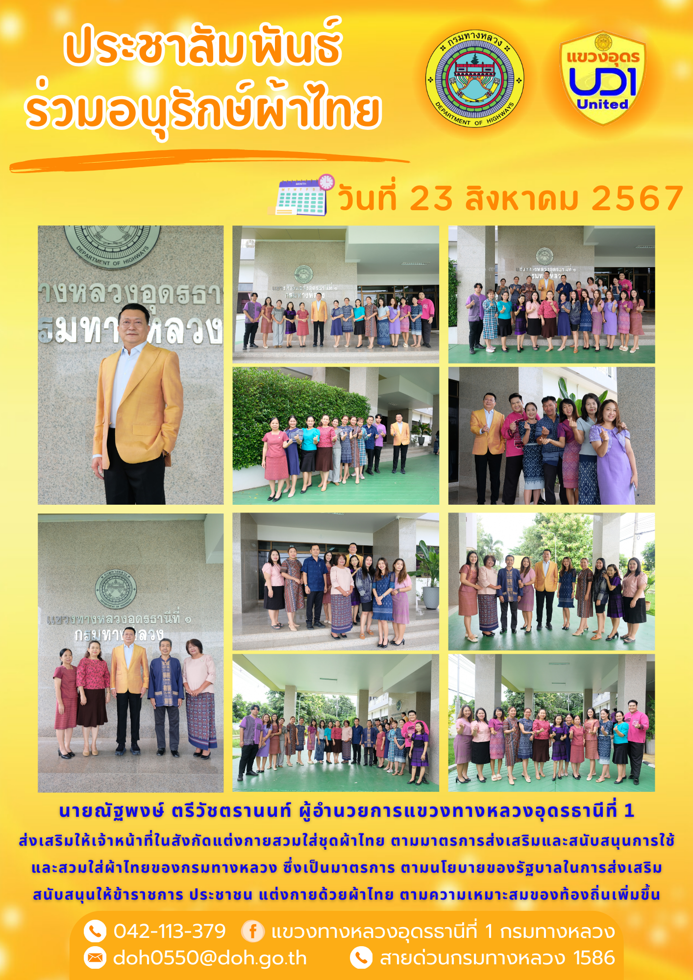 นายณัฐพงษ์ ตรีวัชตรานนท์ ผู้อำนวยการแขวงทางหลวงอุดรธานีที่ 1 ส่งเสริมให้เจ้าหน้าที่ในสังกัดแต่งกายสวมใส่ชุดผ้าไทย ตามมาตรการส่งเสริมและสนับสนุนการใช้และสวมใส่ผ้าไทยของกรมทางหลวง ซึ่งเป็นมาตรการ ตามนโยบายของรัฐบาลในการส่งเสริมสนับสนุนให้ข้าราชการ ประชาชน แต่งกายด้วยผ้าไทย ตามความเหมาะสมของท้องถิ่นเพิ่มขึ้น