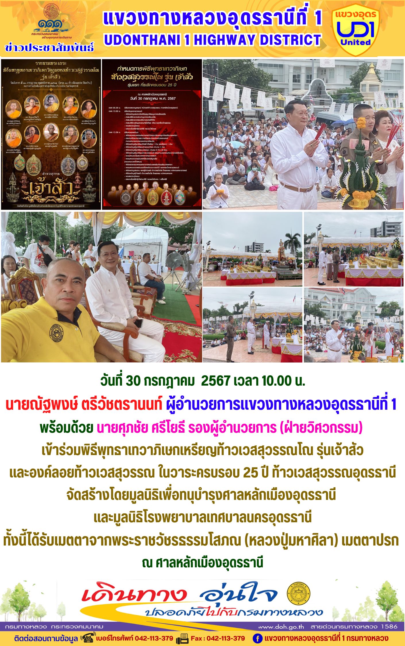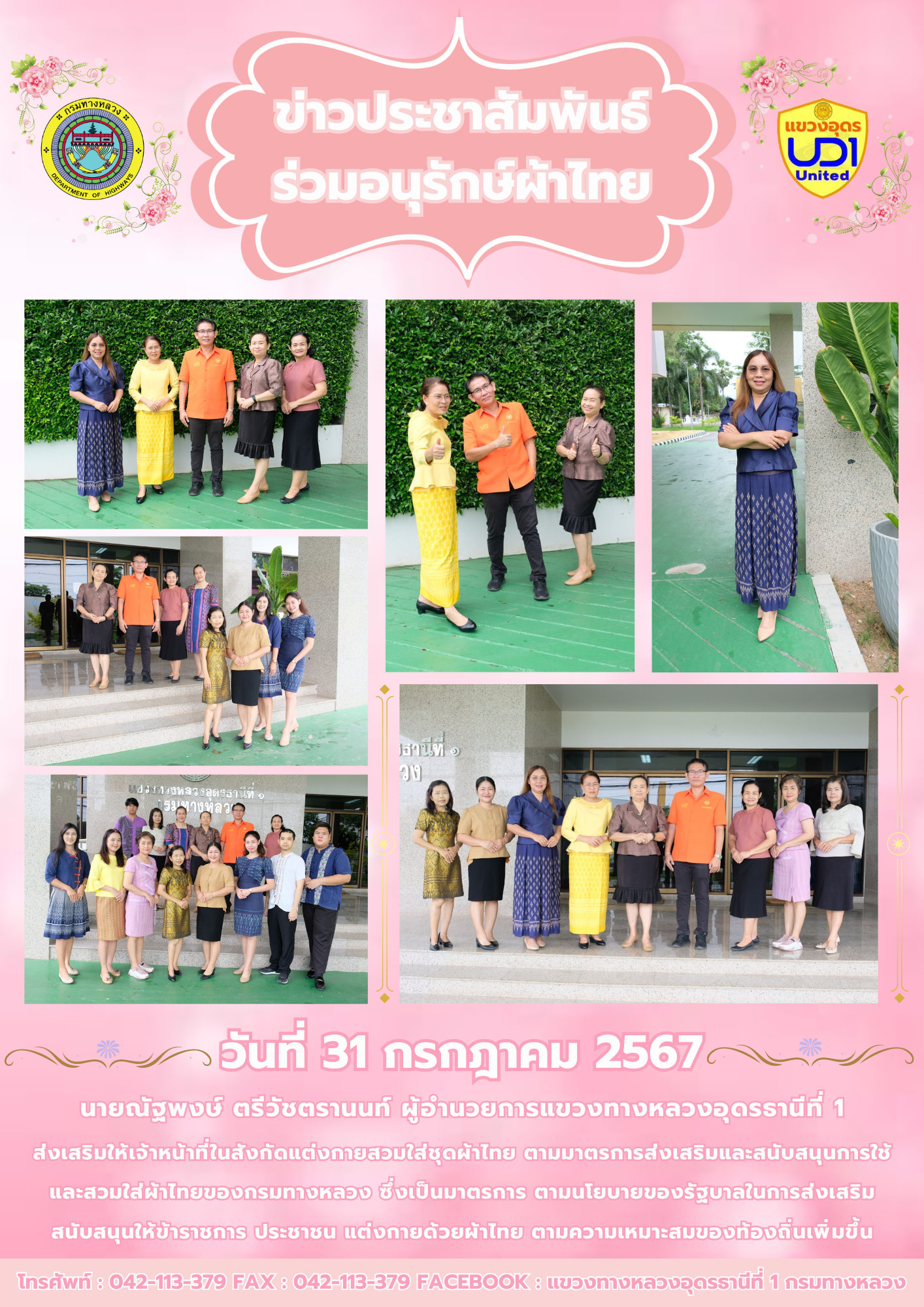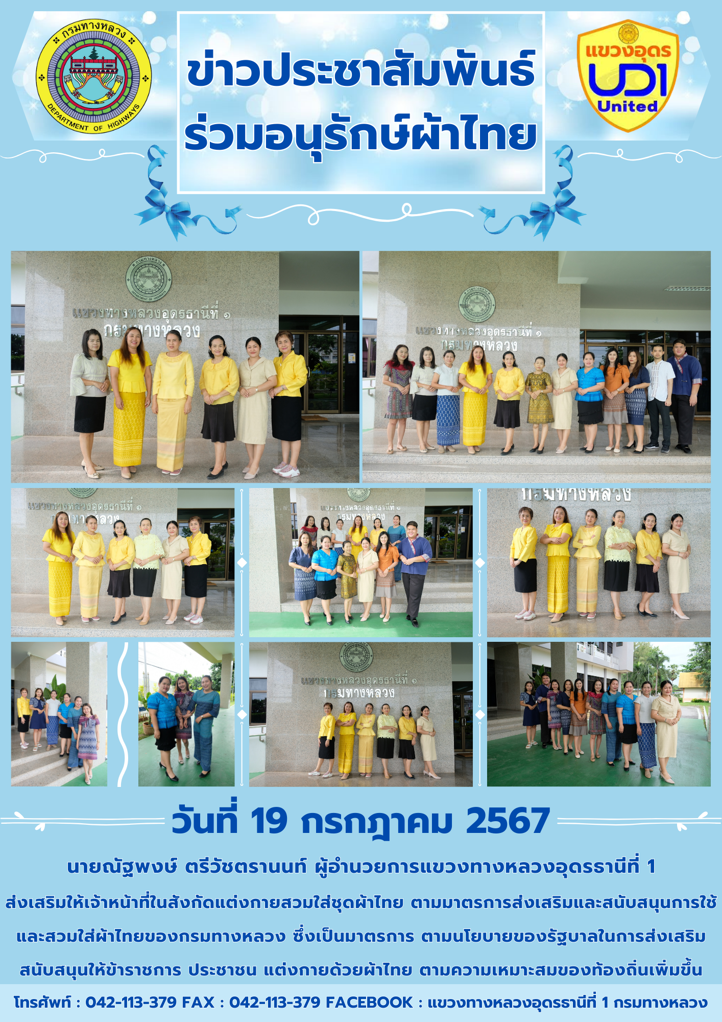 นายณัฐพงษ์ ตรีวัชตรานนท์ ผู้อำนวยการแขวงทางหลวงอุดรธานีที่ 1 พร้อมด้วย นางพานิช สาระมาศ รองผู้อำนวยการ (ฝ่ายบริหารงานทั่วไป) และเจ้าหน้าที่ในสังกัดร่วมแต่งกายสวมใส่ชุดผ้าไทยตามมาตรการส่งเสริมและสนับสนุนการใช้ และสวมใส่ผ้าไทยของกรมทางหลวง ซึ่งเป็นมาตรการตามนโยบายของรัฐบาลในการส่งเสริม และสนับสนุนให้ข้าราชการ ประชาชน แต่งกายด้วยผ้าไทย ตามความเหมาะสมของท้องถิ่นเพิ่มขึ้น