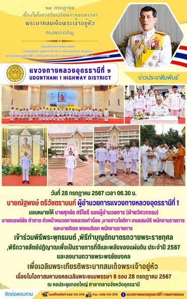 นายณัฐพงษ์ ตรีวัชตรานนท์ ผู้อำนวยการแขวงทางหลวงอุดรธานีที่ 1 พร้อมด้วย นายจักรกริช แก้วแสงอ่อน รองผู้อำนวยการ (ฝ่ายปฏิบัติการ) และเจ้าหน้าที่ในสังกัดร่วมแต่งกายสวมใส่ชุดผ้าไทยตามมาตรการส่งเสริมและสนับสนุนการใช้และสวมใส่ผ้าไทยของกรมทางหลวง ซึ่งเป็นมาตรการตามนโยบายของรัฐบาลในการส่งเสริมและสนับสนุนให้ข้าราชการ ประชาชน แต่งกายด้วยผ้าไทย ตามความเหมาะสมของท้องถิ่นเพิ่มขึ้น